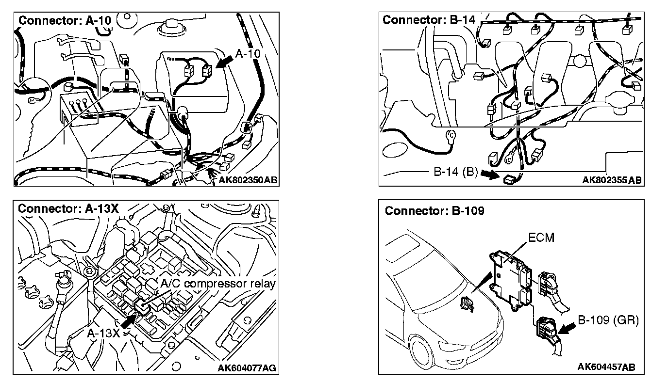 - Open or shorted A/C compressor relay circuit, harness damage or connector damage.