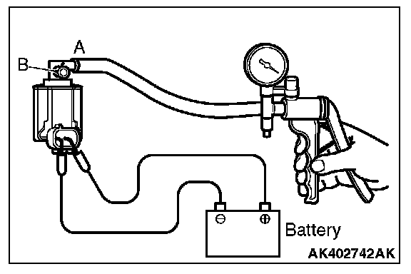 4. As described in the chart below, check airtightness by applying a vacuum with voltage applied directly from the battery to the EVAP purge solenoid and without applying voltage.