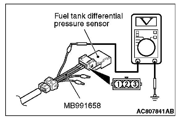 1. Disconnect the fuel tank differential pressure sensor connector and connect special tool MB991658 between the terminals of the disconnected connector.