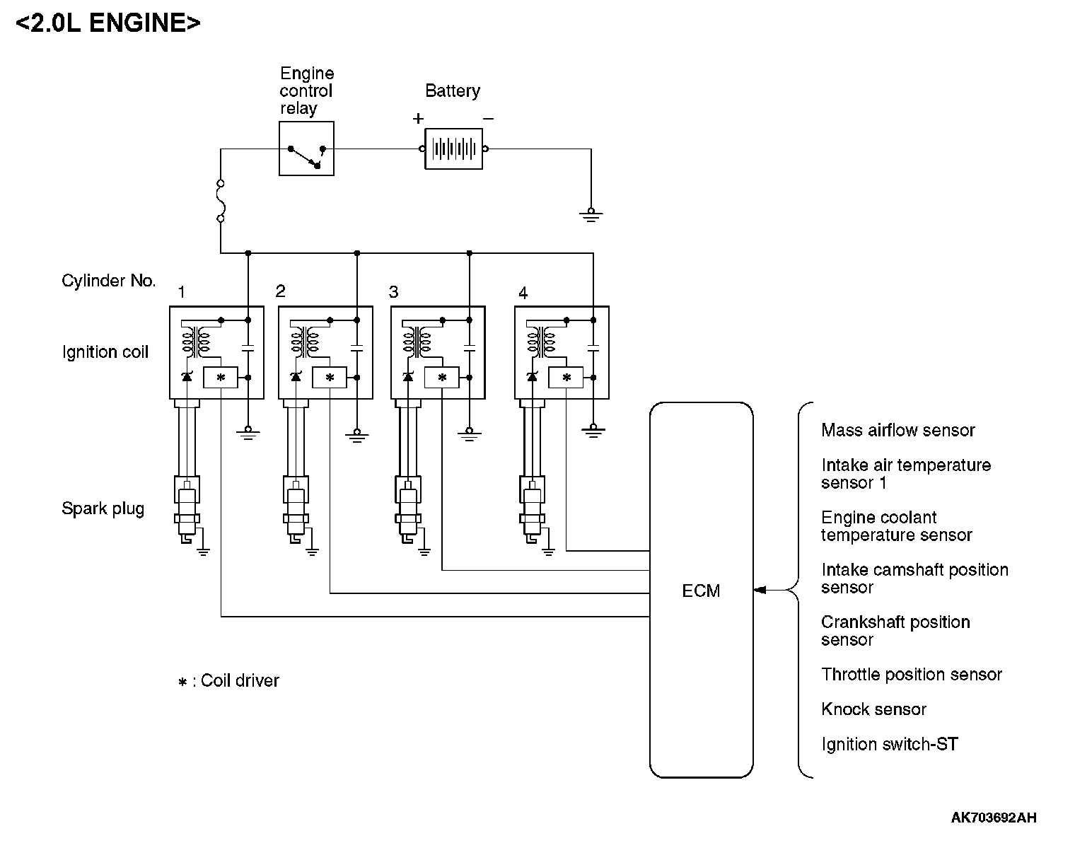The ECM determines which ignition coil should be controlled by means of the signals from the camshaft position sensor and the crank angle sensor. It also detects the crankshaft position, in order to provide ignition at the most appropriate timing in response to the engine operation conditions. When the engine is cold or running at high altitudes, the ignition timing is slightly advanced to provide optimum performance. Furthermore, if knocking occurs, the ignition timing is gradually retarded until knocking ceases.