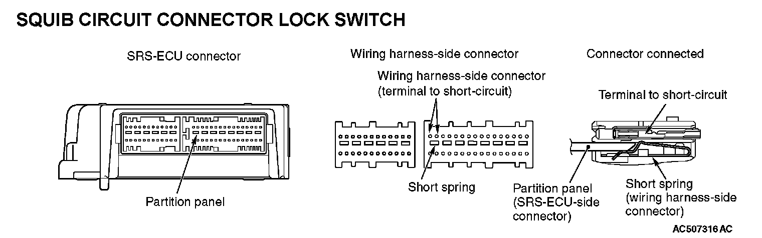 SQUIB CIRCUIT CONNECTOR LOCK SWITCHThis mechanism prevents the improper deployment of air bag module because of the current application to the squib due to the static electricity when connectors between SRS-ECU and air bag modules (squibs) are disconnected. When the connector is disconnected, the short spring short circuits the power supply side terminal and ground side terminal of squibs, and prevents the static electricity from generating the potential difference. This connector mechanism is adopted for the following connectors.