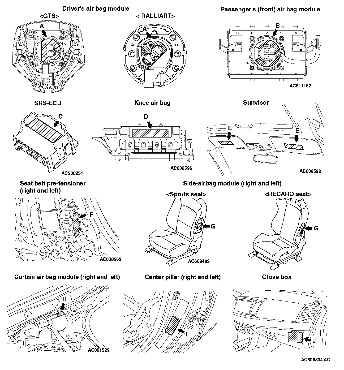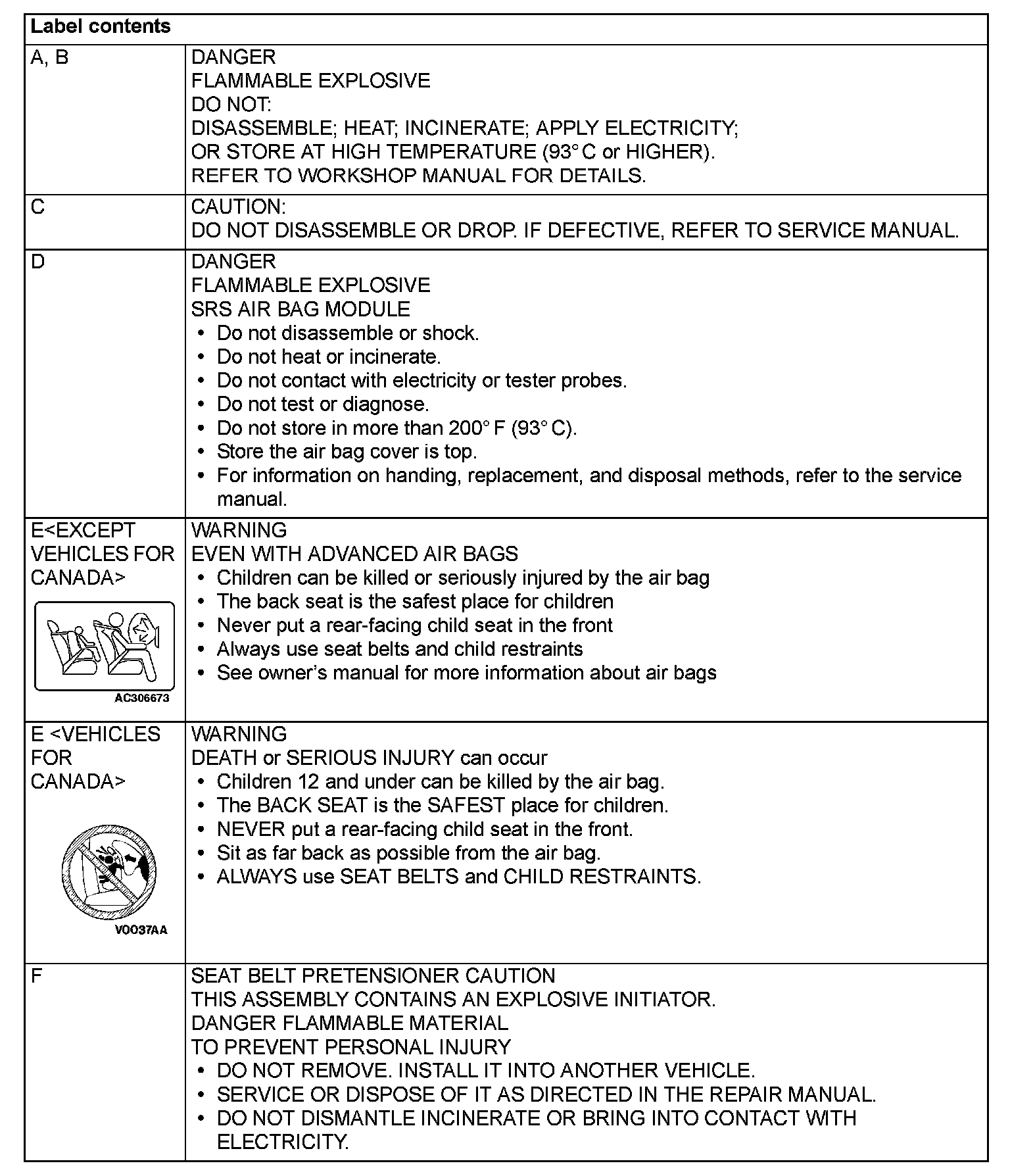 WARNING/CAUTION LABELSA number of caution labels related to the SRS are found in the vehicle, as shown in the following illustrations. Follow label instructions when servicing SRS. The label I is not to be removed except by owner. If the other labels are dirty or damaged, replace them.