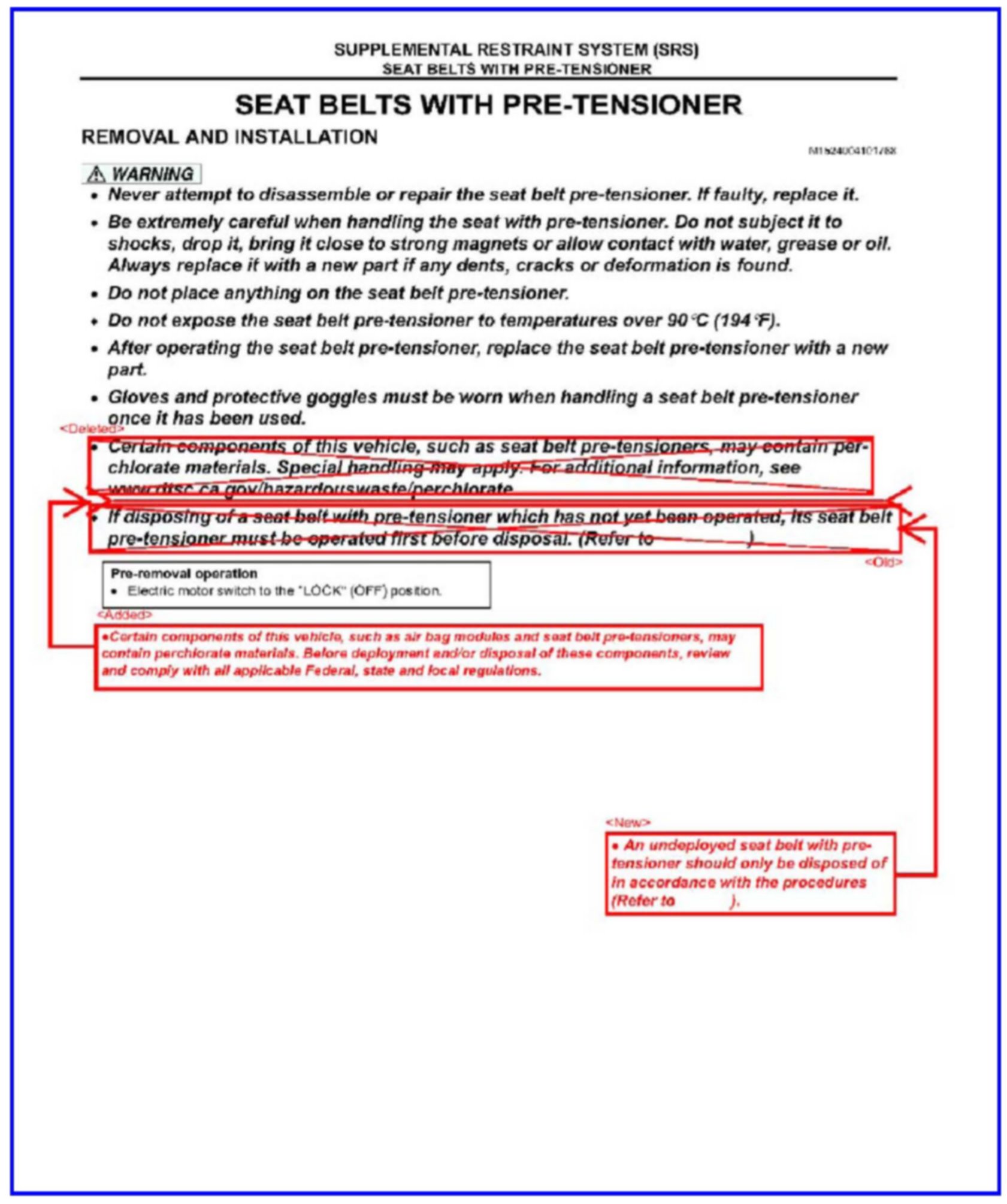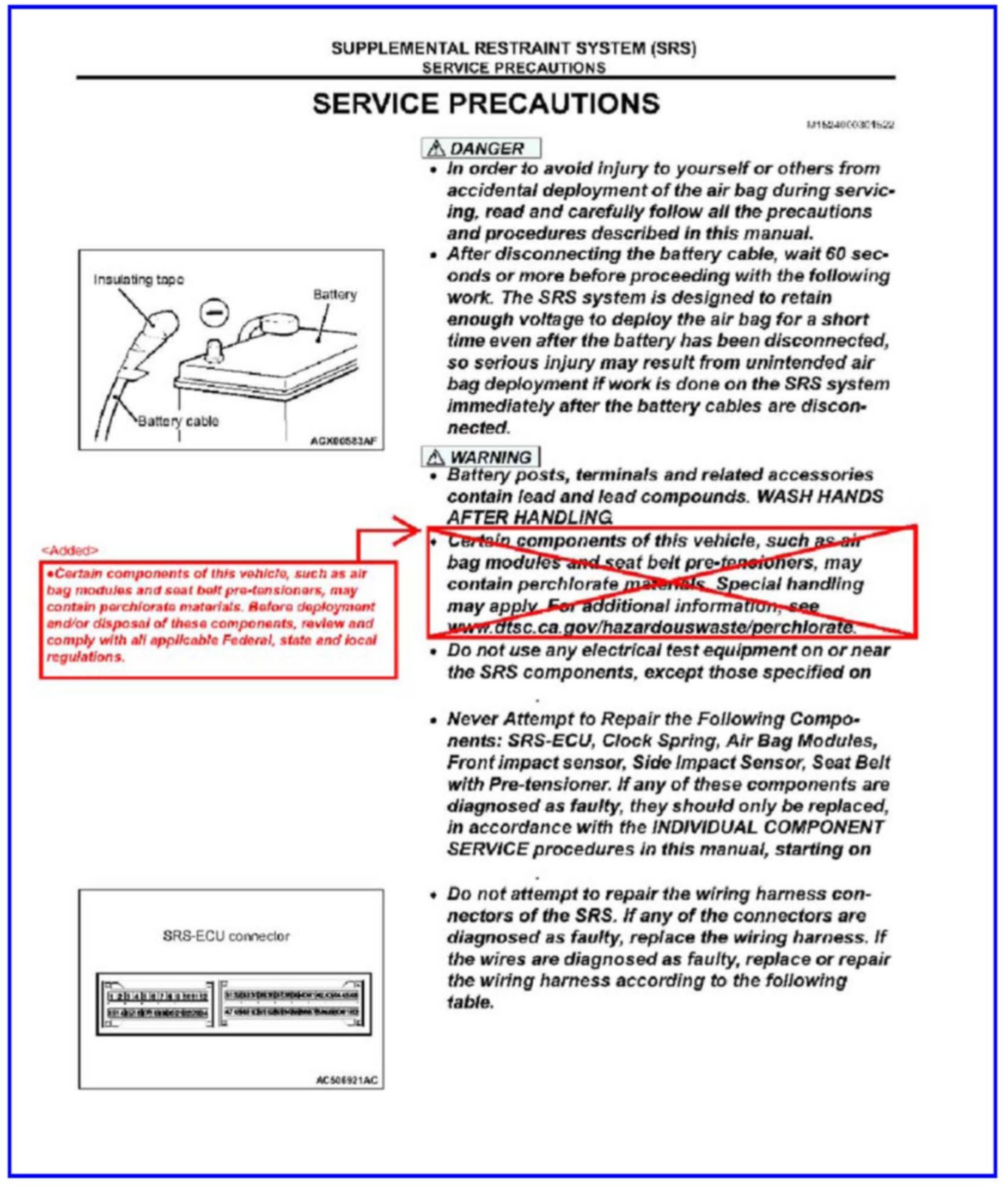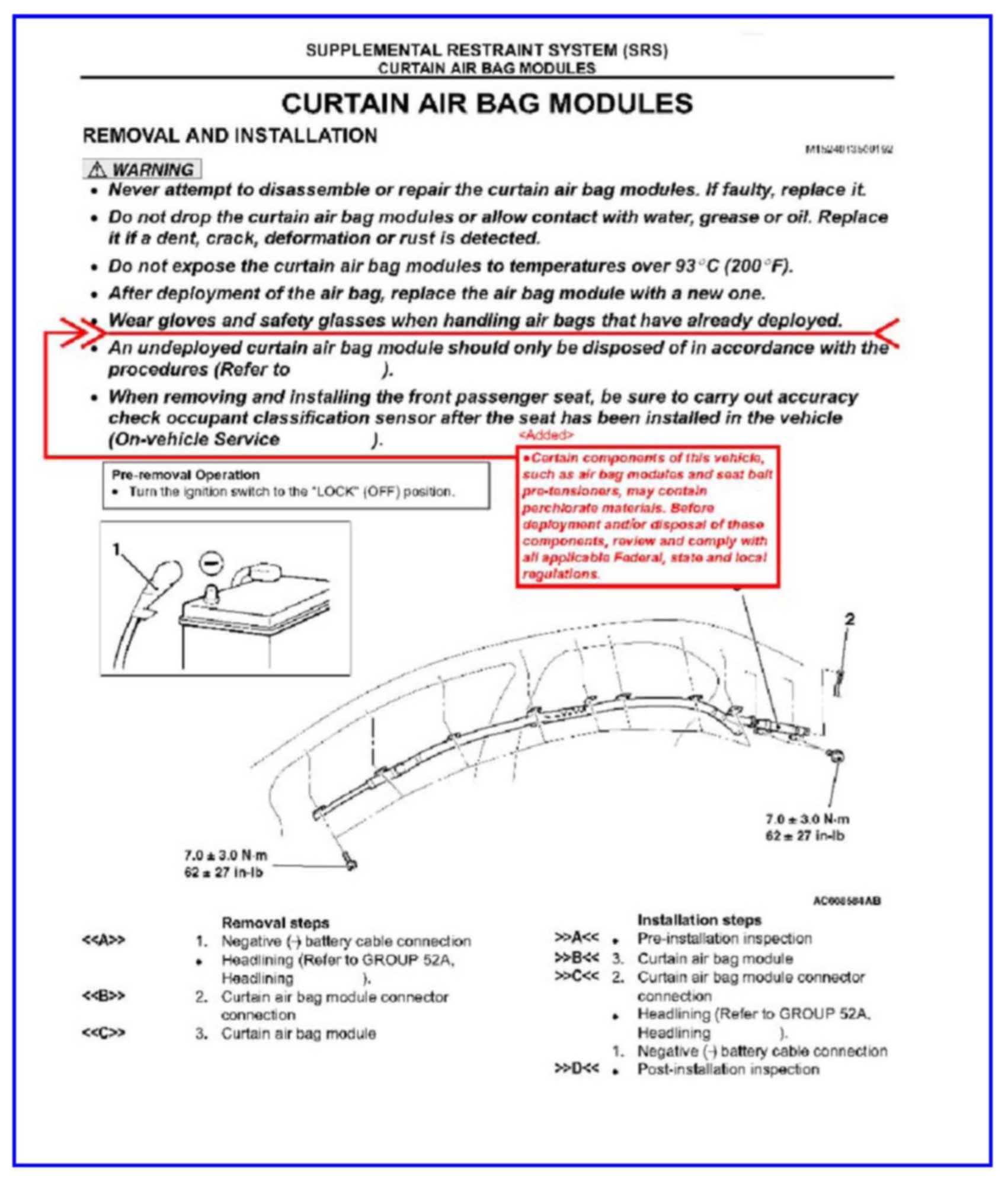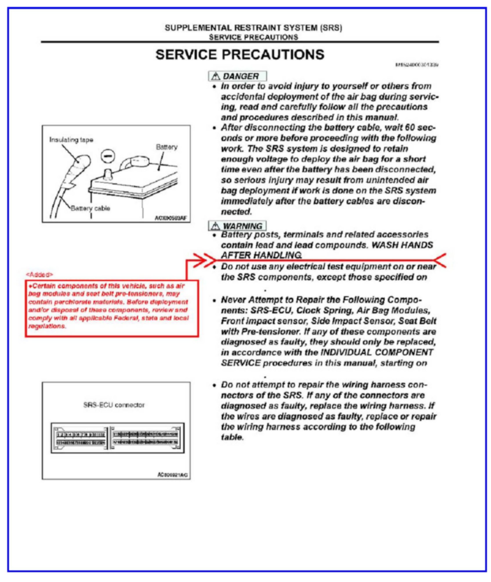 Caution statements regarding the disposal of certain SRS components have been incorrect in the service manuals of affected vehicles. This TSB provides updated caution statements.