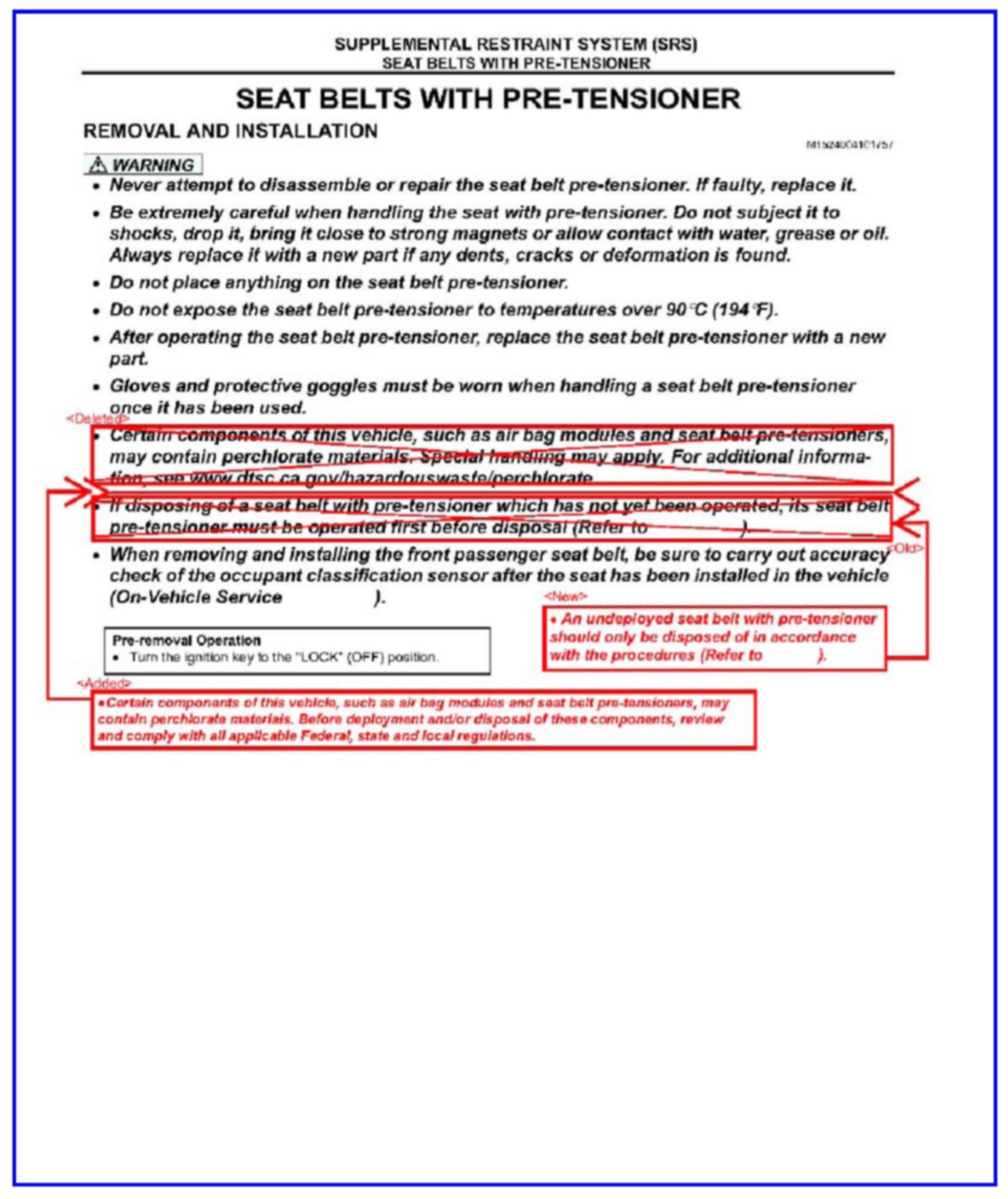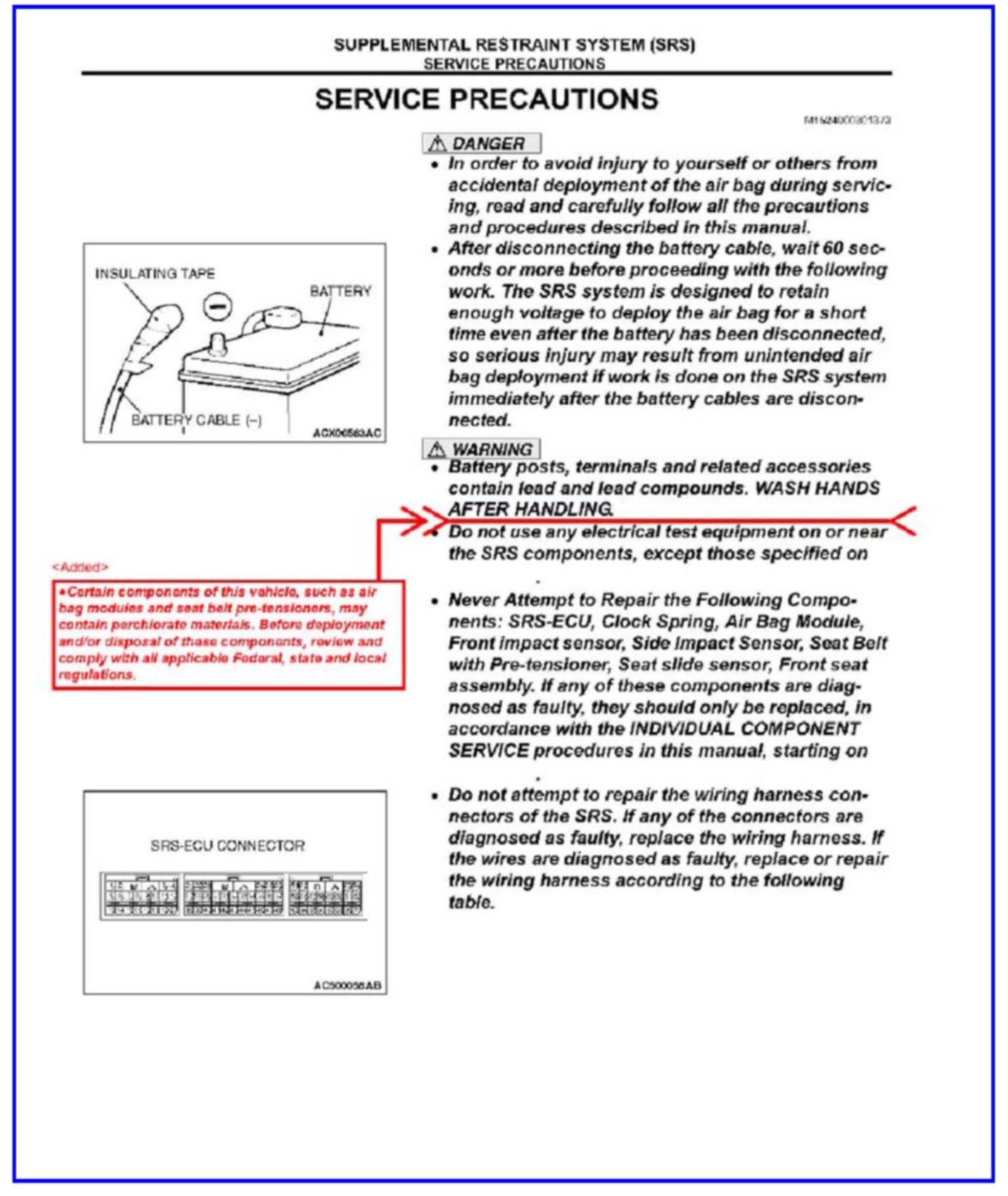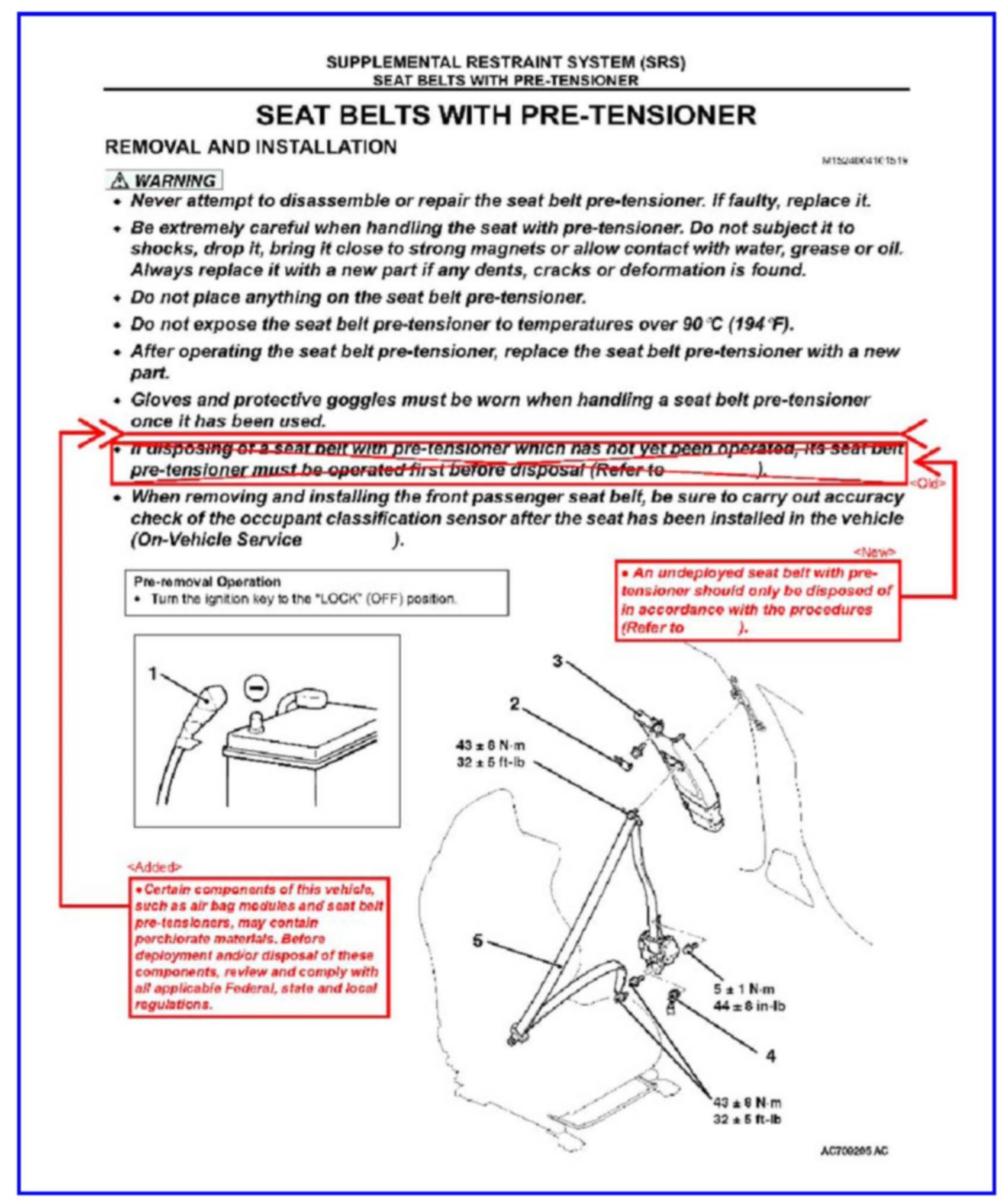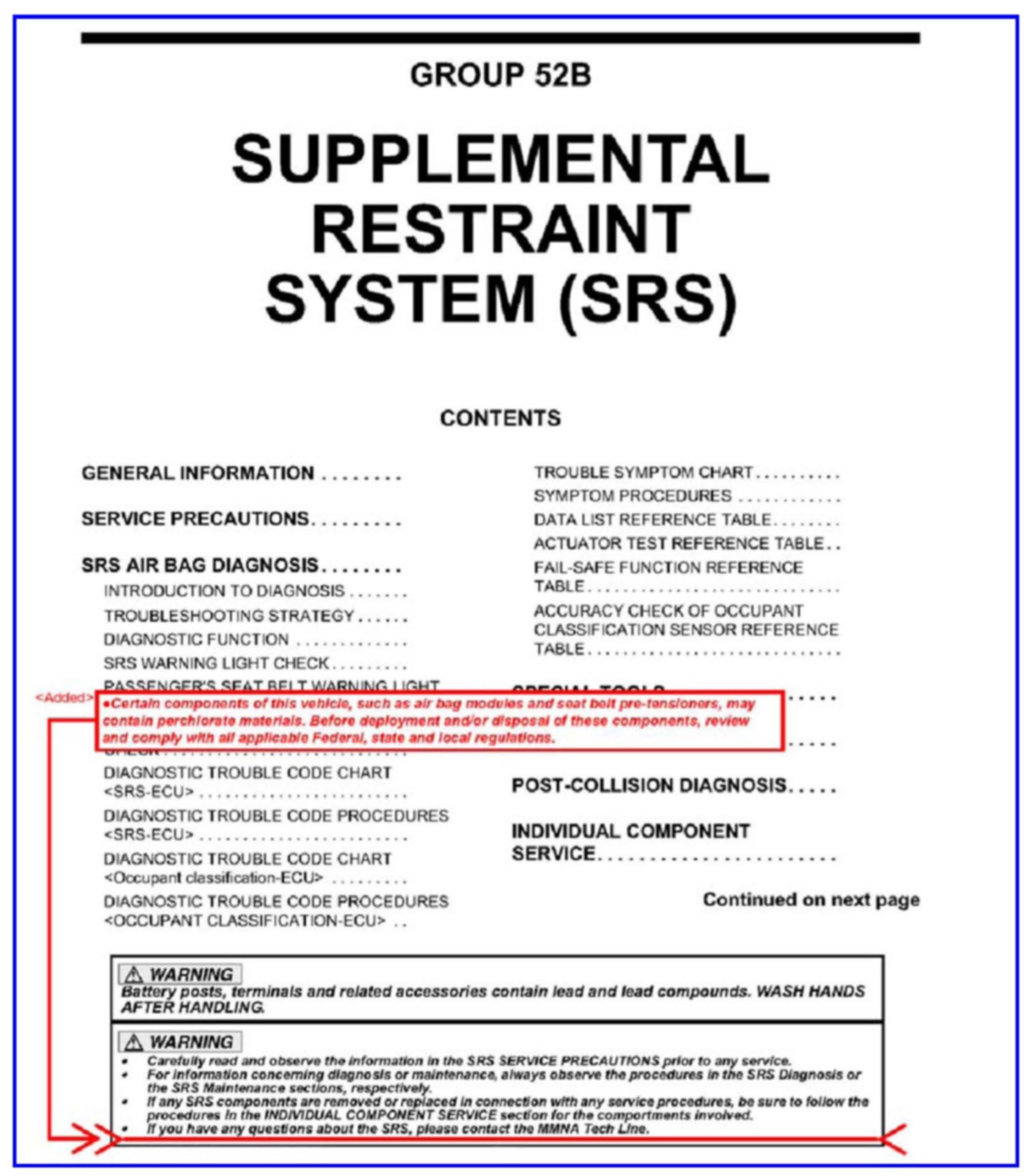 Caution statements regarding the disposal of certain SRS components have been incorrect in the service manuals of affected vehicles. This TSB provides updated caution statements.