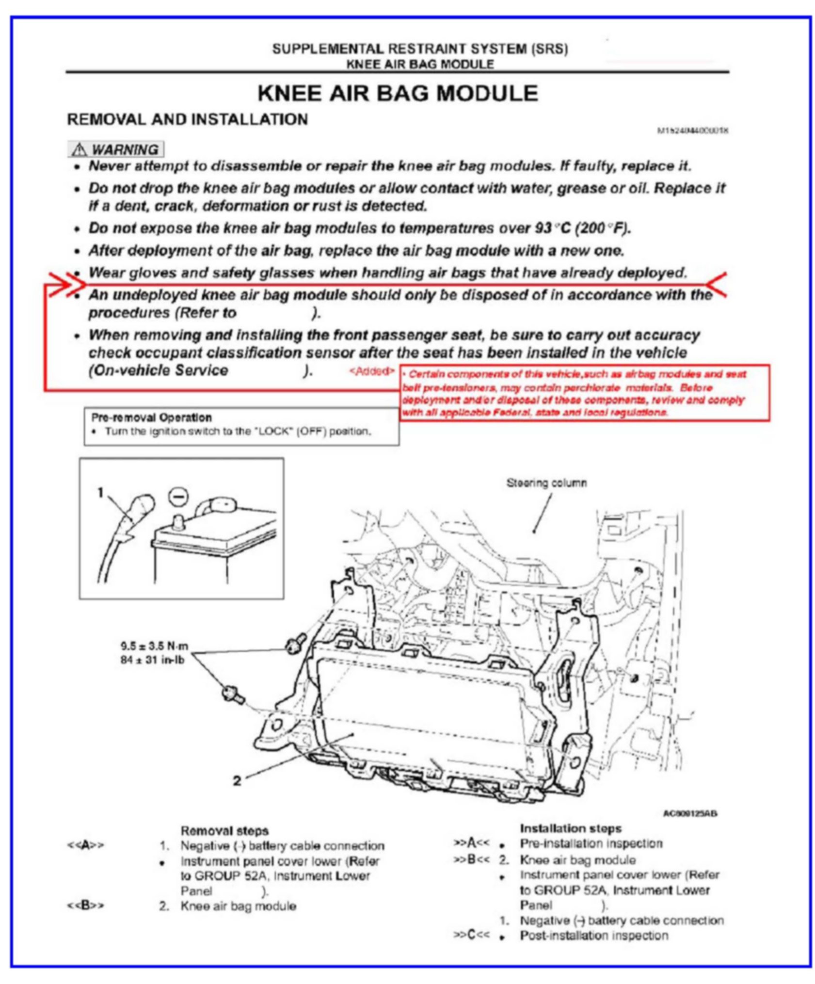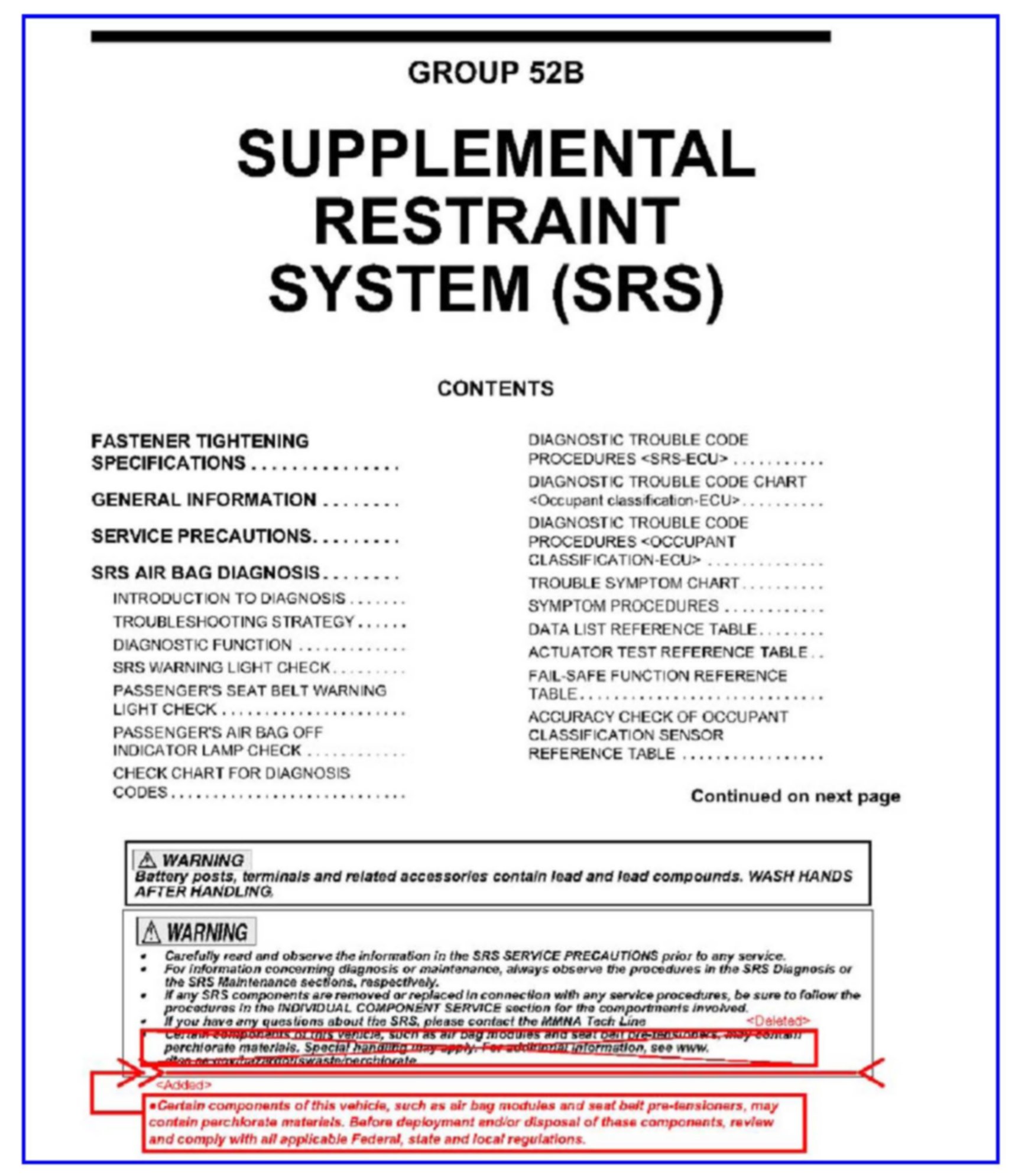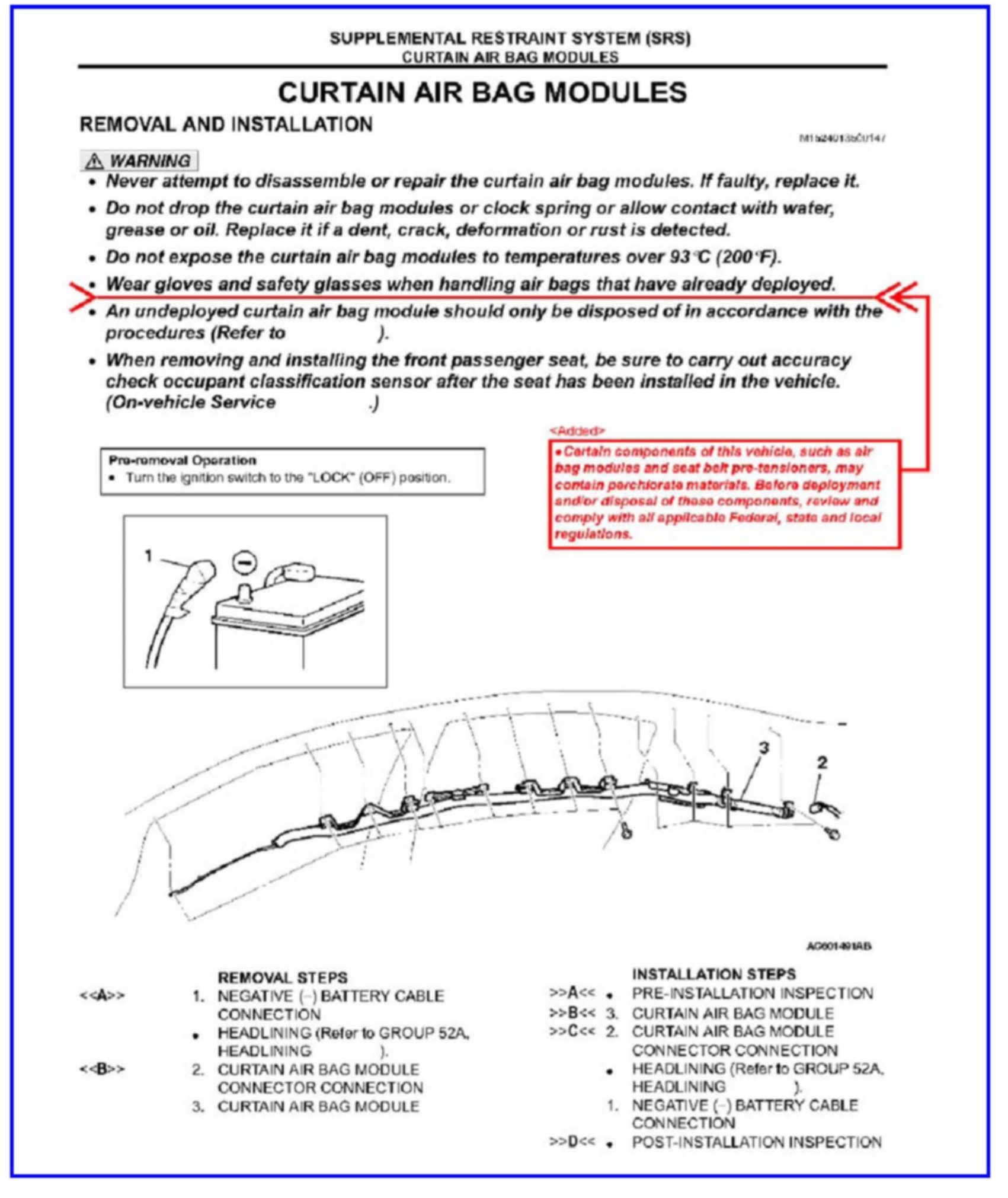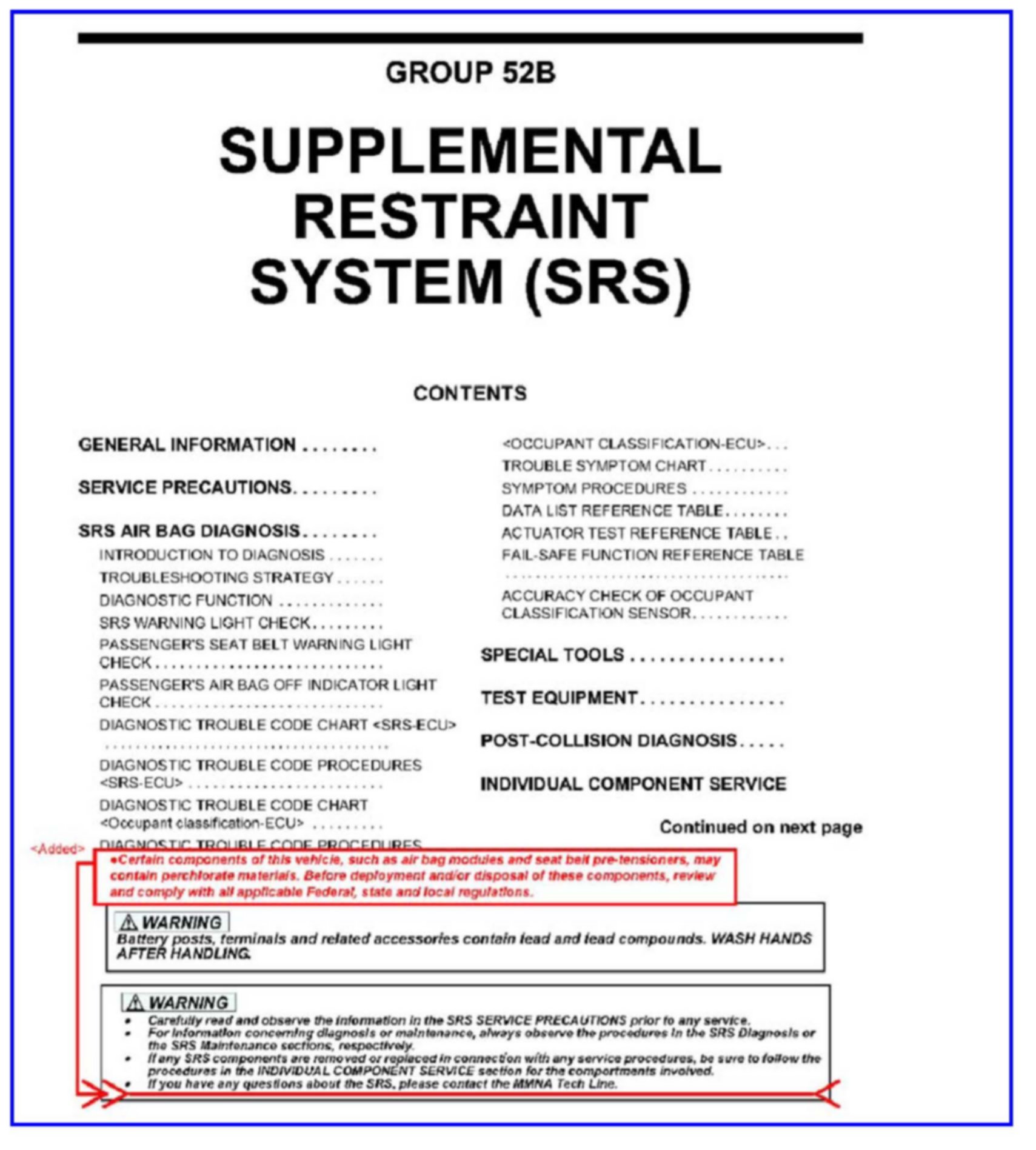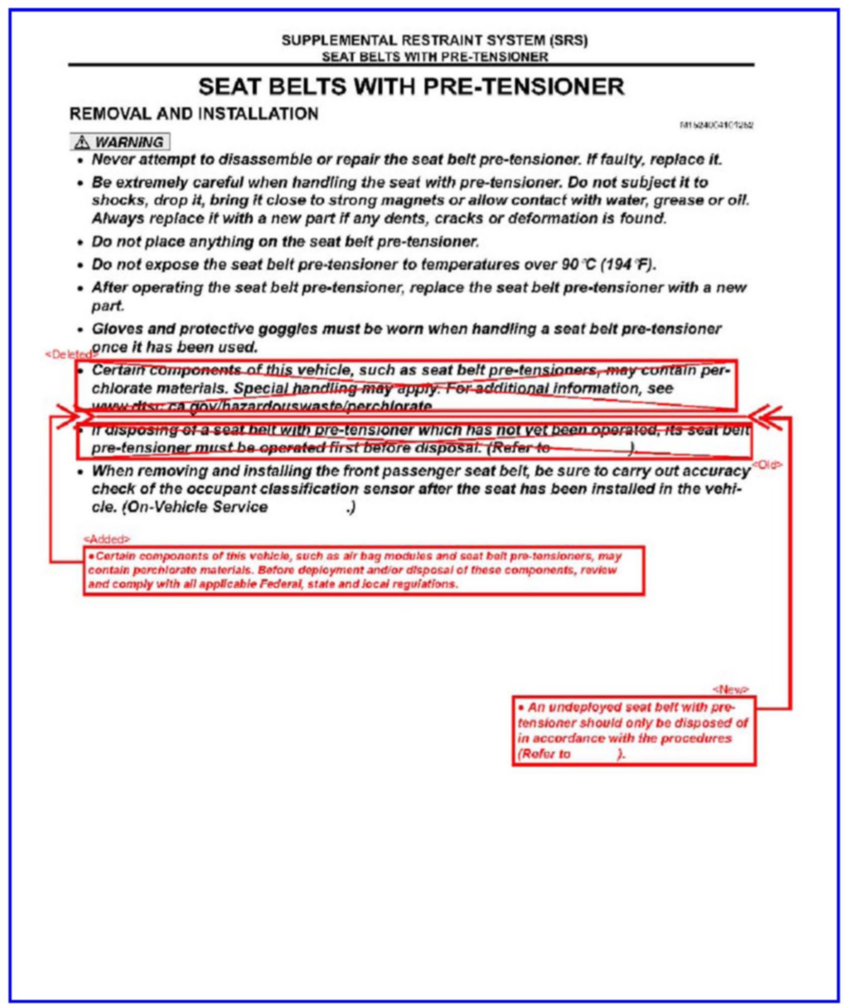 Caution statements regarding the disposal of certain SRS components have been incorrect in the service manuals of affected vehicles. This TSB provides updated caution statements.