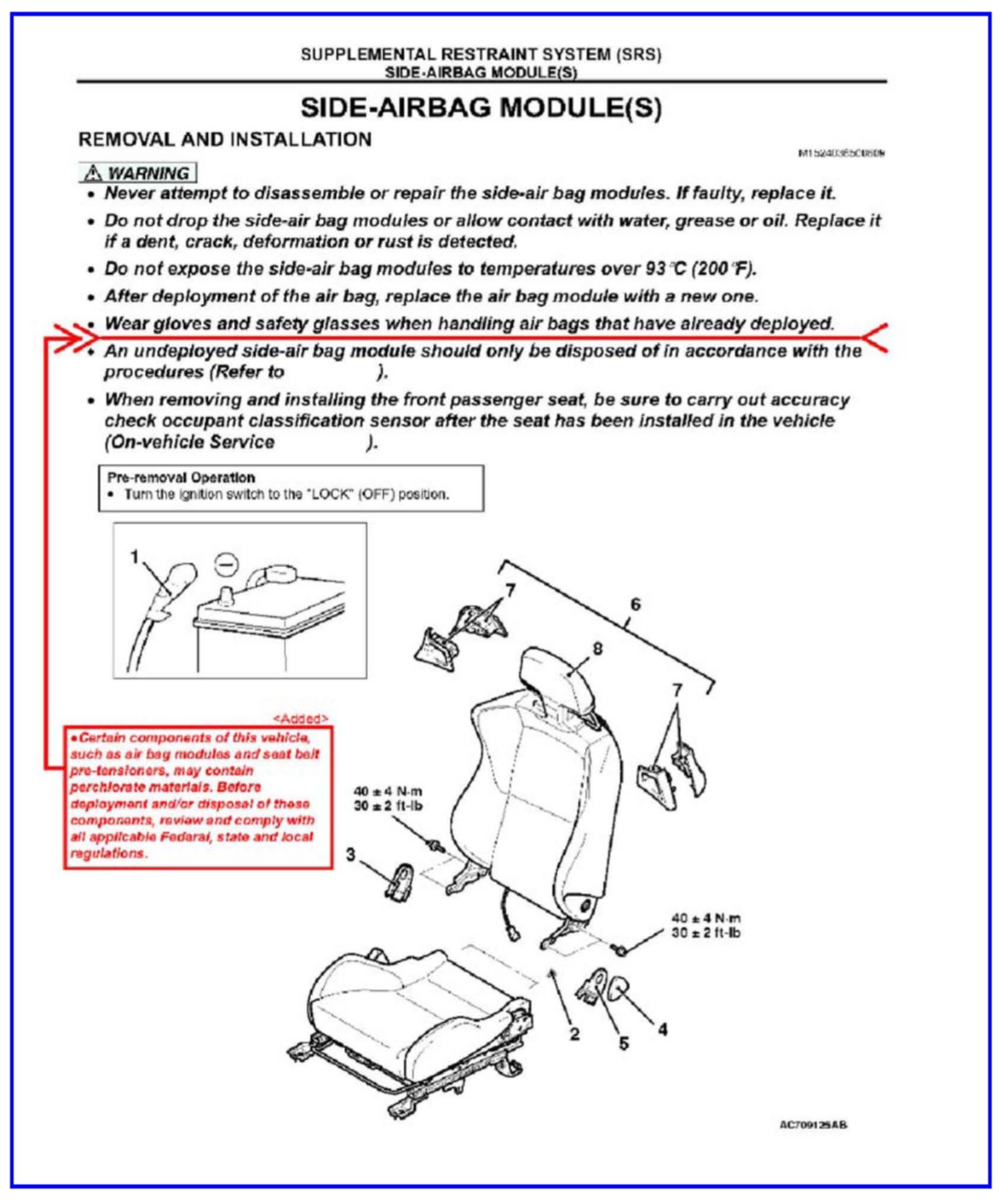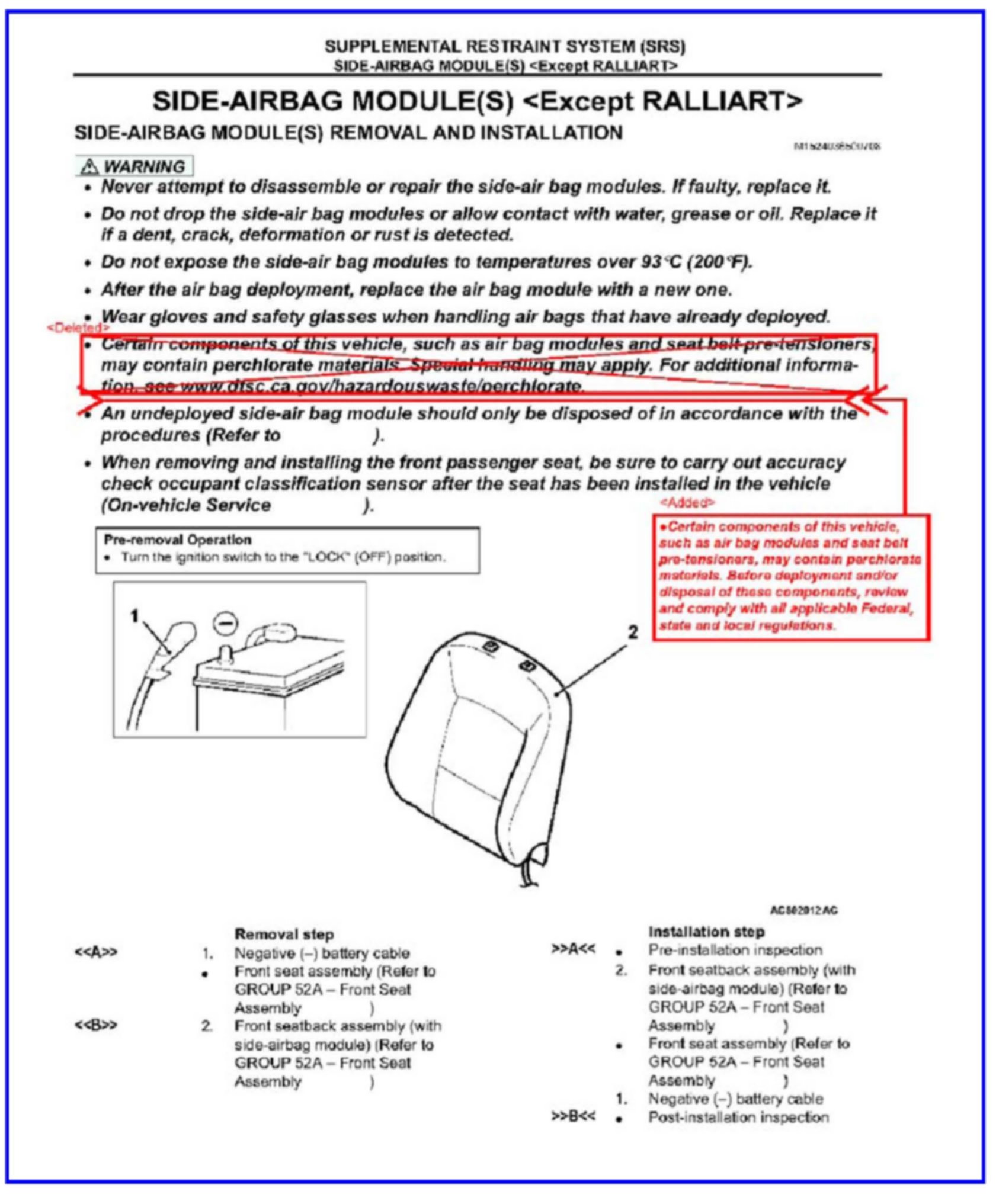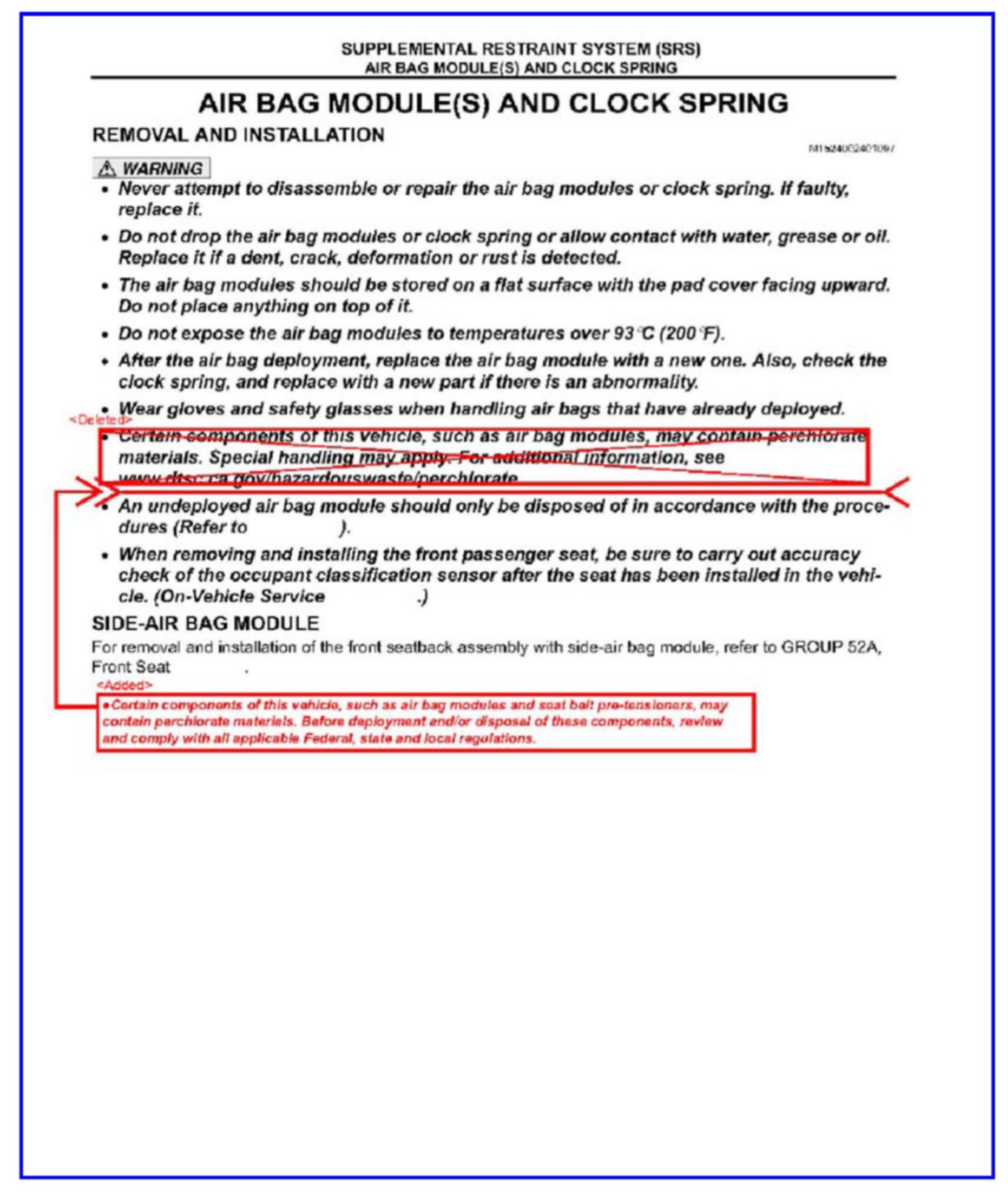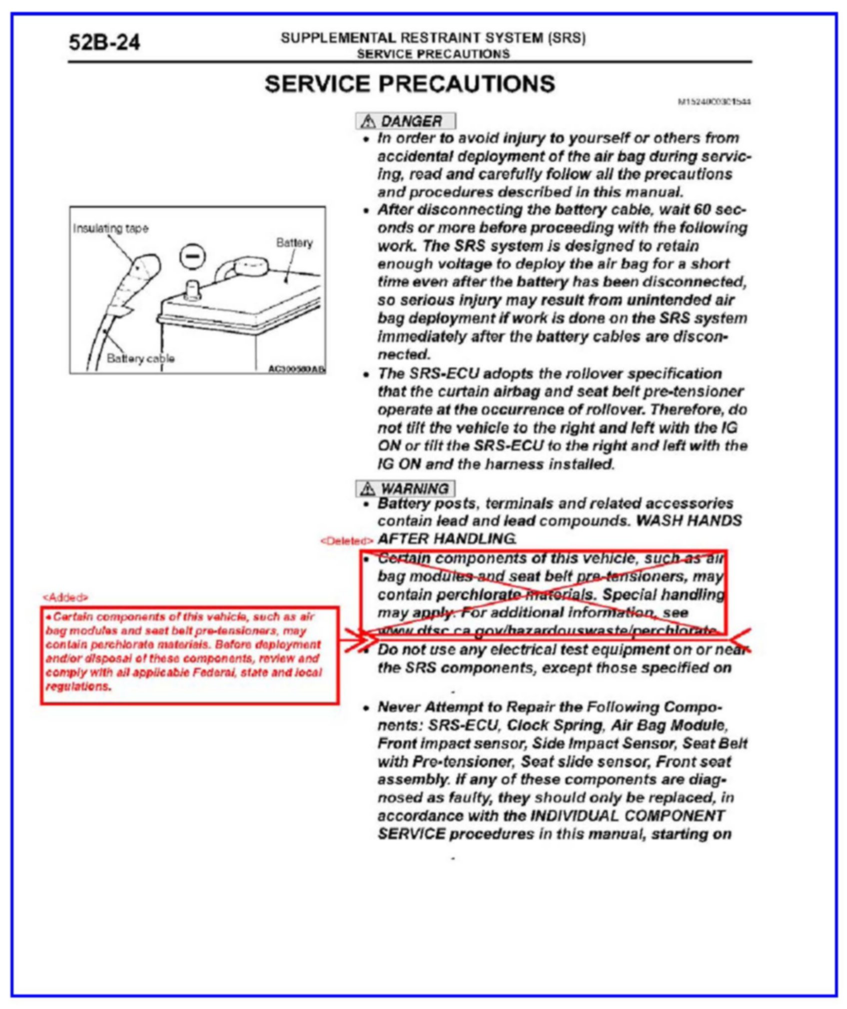 Caution statements regarding the disposal of certain SRS components have been incorrect in the service manuals of affected vehicles. This TSB provides updated caution statements.