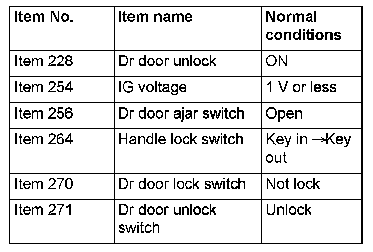 NO [Normal condition is not displayed for item No. 228.] : Troubleshoot the ETACS-ECU. Refer to Diagnosis - Inspection Procedure 4 "ETACS-ECU does not receive any signal from the front door lock actuator". Inspection Procedure 4