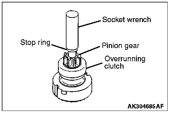 1. Apply a long socket wrench of an appropriate size to the stop ring and strike the wrench to drive out the stop ring toward the pinion gear side.
