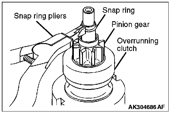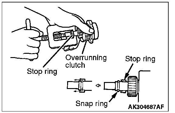 2. Remove the snap ring with snap ring pliers, then remove the stop ring and overrunning clutch.
