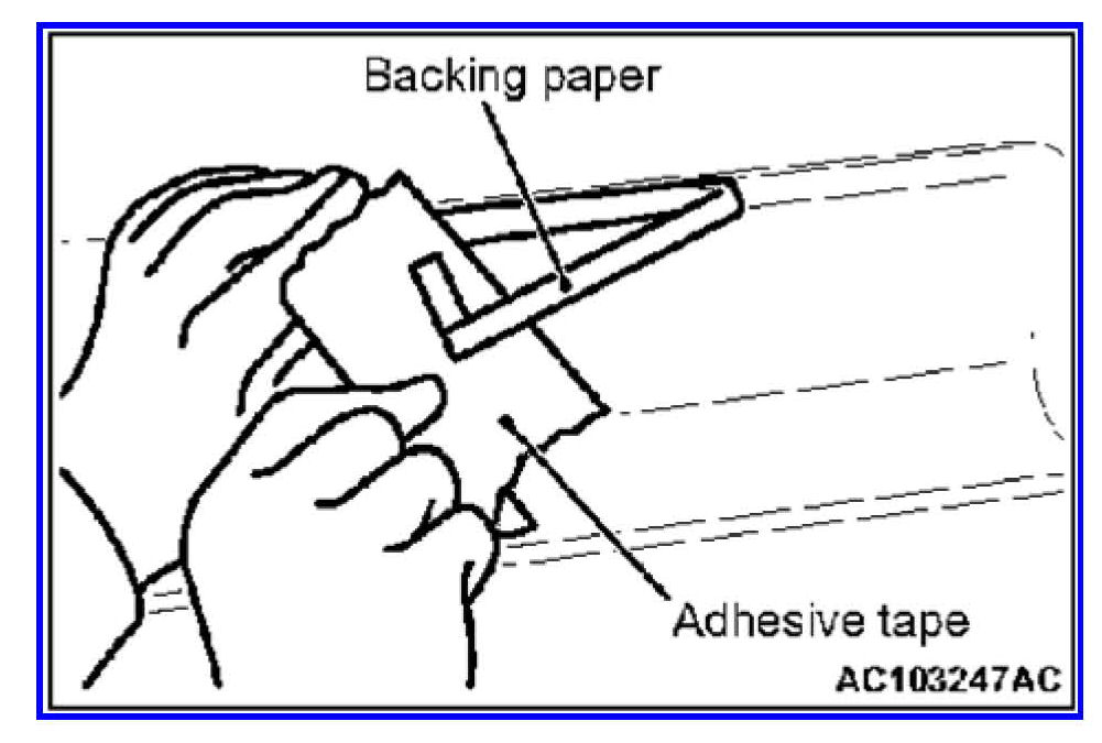 If the adhesive tape is difficult to affix in cold temperature, etc., warm the bonding surfaces of the body and side sill garnish to about 40-60° C (104-140° F) before attaching adhesive tape.