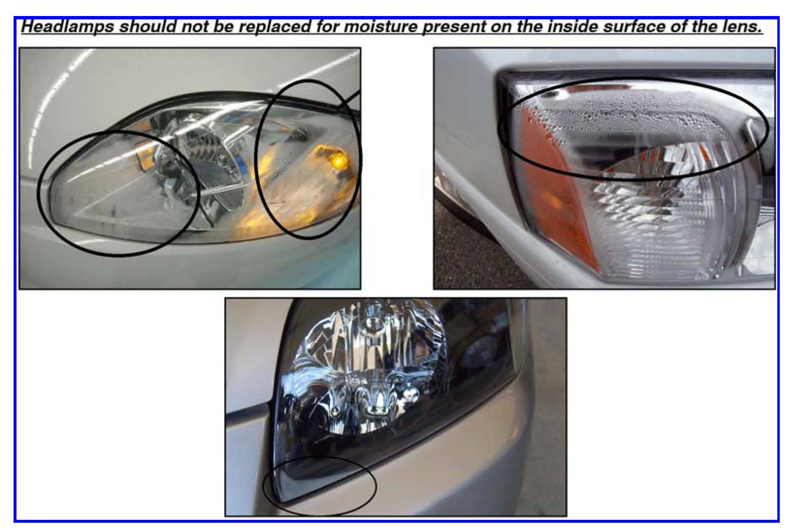 The photos show examples of headlights that should NOT be replaced for leaking. Use these photos as a guideline when determining headlamp replacement.