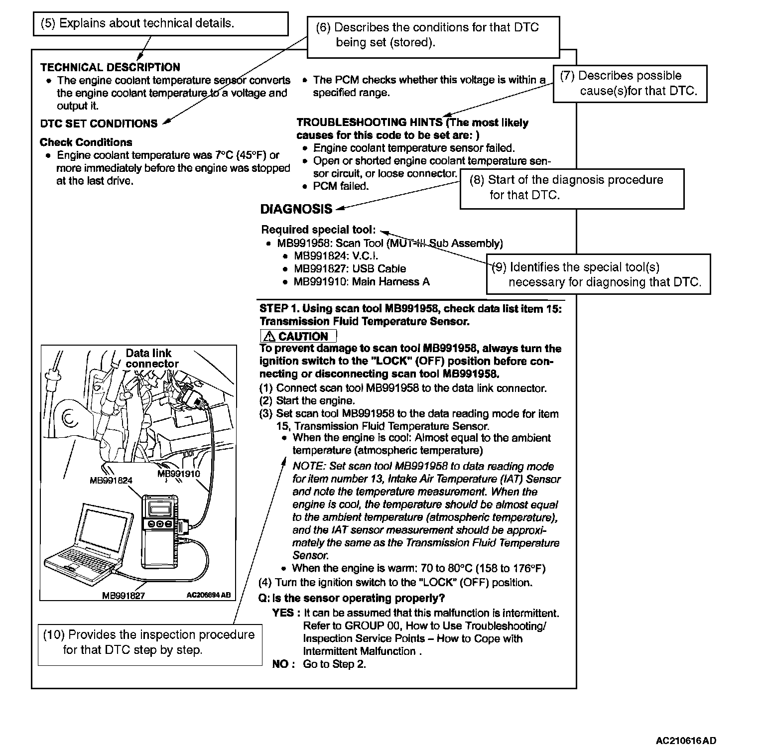 Indicates the inspection procedures corresponding to each diagnostic trouble code.