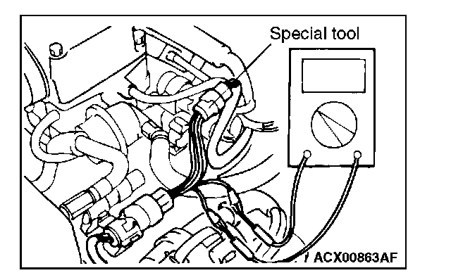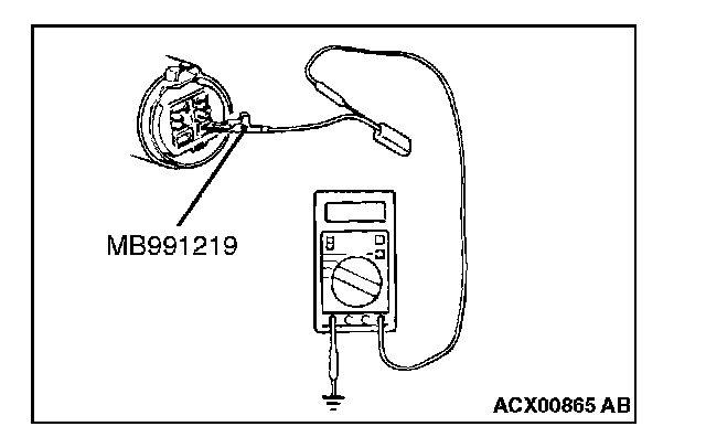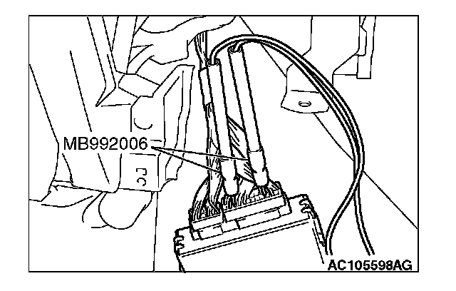 Inspect by inserting a test probe from the harness side. If the connector is too small to insert a test probe (e.g. control unit connector), do not insert it forcibly. Use special tool MB992006 (extra fine probe).