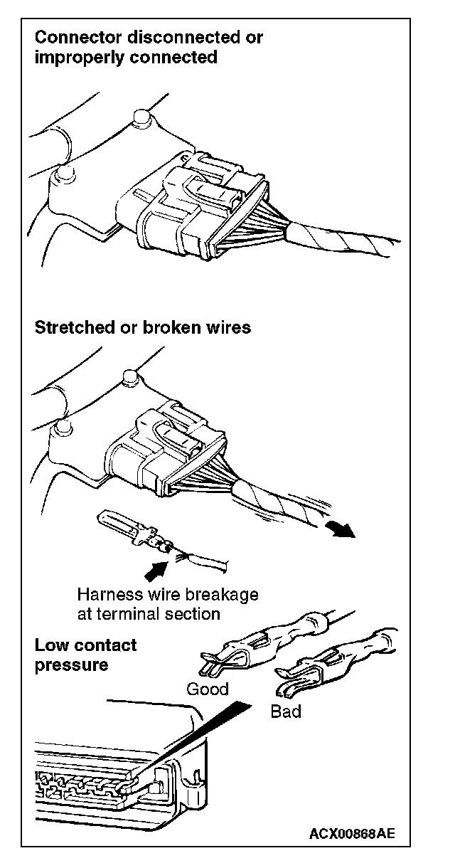 The inspection harness for connector pin contact pressure should be used. The test probe should never be forcibly inserted, as it may cause a defective contact.
