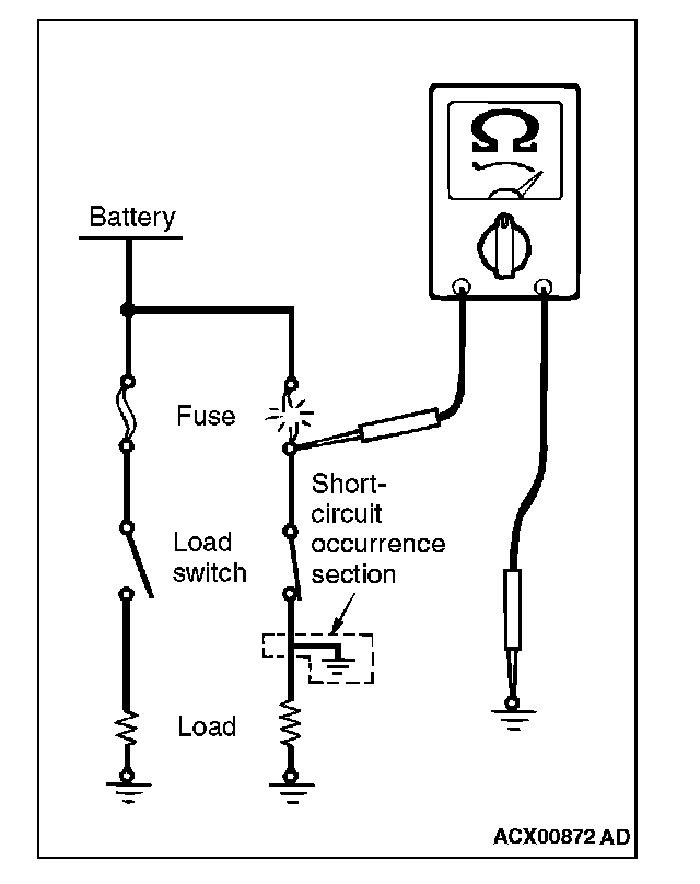 Remove the blown fuse and measure the resistance between the load side of the blown fuse and the ground. Close the switches of all circuits which are connected to this fuse. If the resistance is almost 0 ohms at this time, there is a short somewhere between these switches and the load. If the resistance is not 0 ohms, there is no short at the present time, but a momentary short has probably caused the fuse to blow. The main causes of a short circuit are the following.