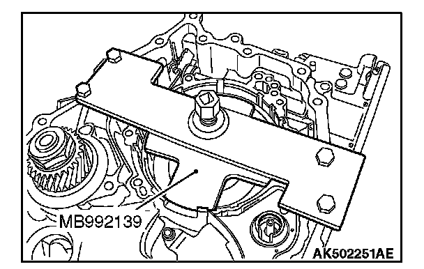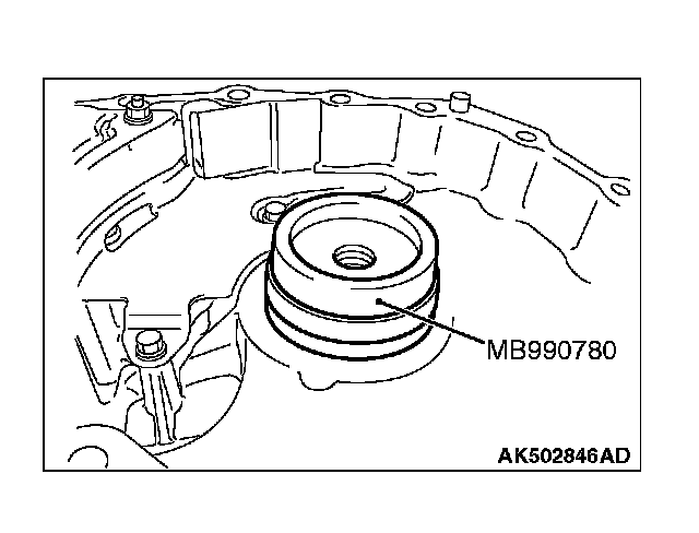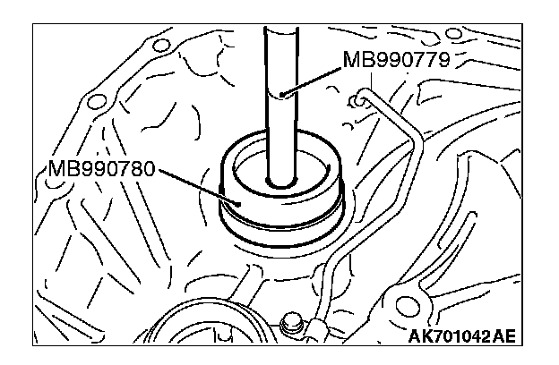 21. Using the special tools MB990779 and MB990780, Install the differential bearing outer race of differential side bearing on the converter housing.