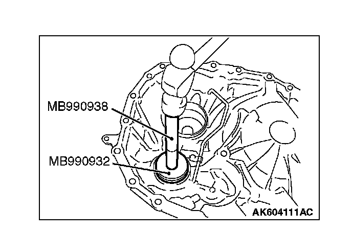24. Using the special tool MB990780, install the outer race of differential side bearing on the transaxle case.