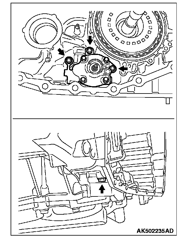 31. Install the oil pump on the transaxle case and tighten the bolt to the specified torque. (One fastening bolt is installed at the backside from the transaxle case side. Only this bolt should be tightened to the specified torque of 28 Nm [21 ft-lb]).