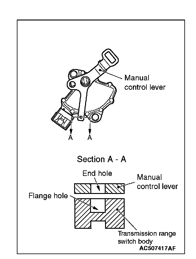4. Align the hole at the end of the manual control lever and the hole in the transmission range switch body flange (section A-A).