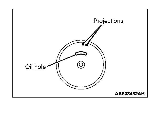 Install the output shaft cover to the clutch housing case assembly with its projections fitted in the slots in the clutch housing case assembly. Make sure that the oil hole in the output shaft cover is up as shown.