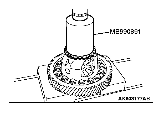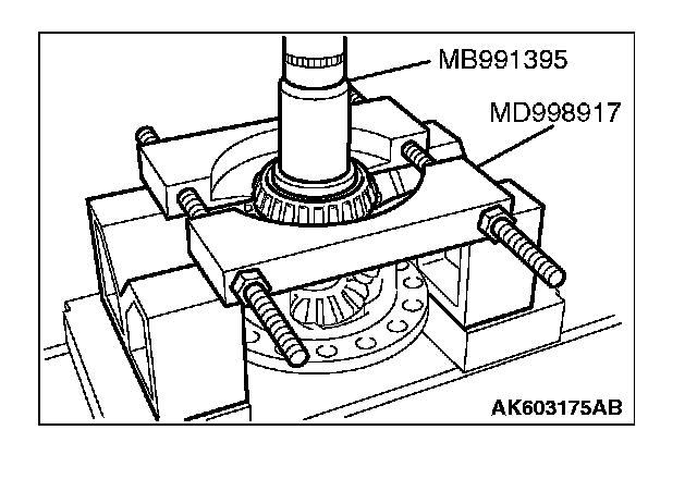 1. Using special tool MD998917 and MB991395, support the tapered roller bearing inner race, and then set them on the press.