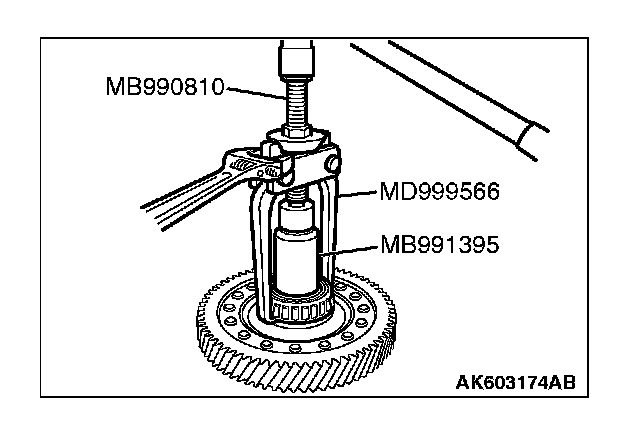 1. Using special tool MB990810, MD999566 and MB991395, remove the tapered roller bearing inner race.
