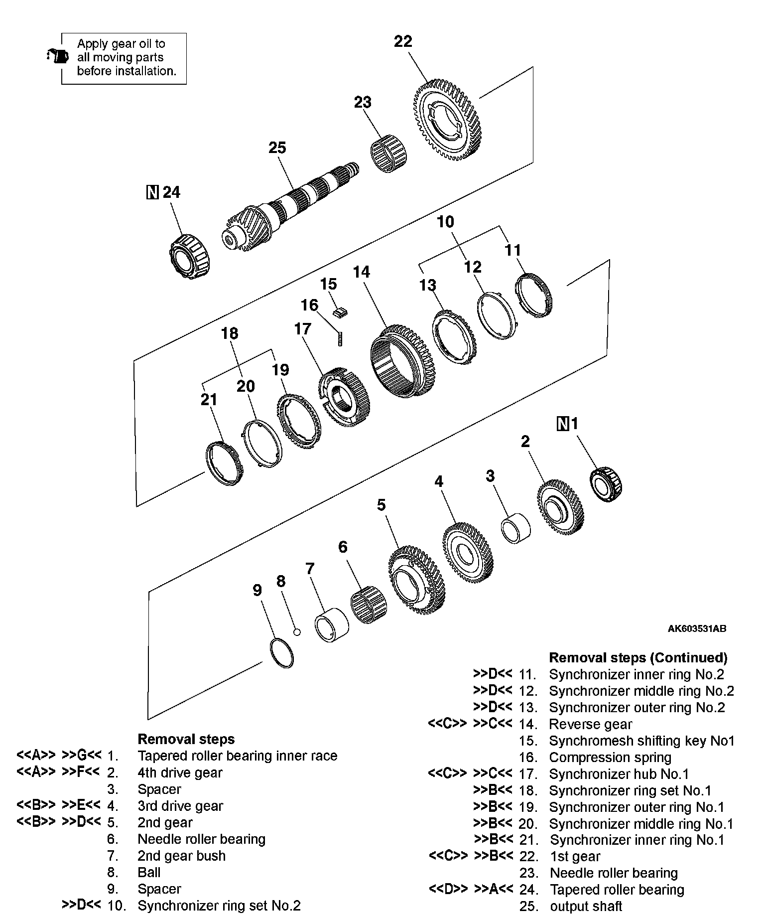The rings of the synchronizer ring set No. 1 and No. 2 are dedicated to the 1st and 2nd gears. Be sure to install the right ring set to the right gear.