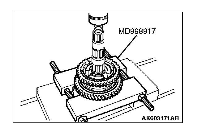 Using special tool MD998917, support the 1st gear and remove the 1st gear, reverse gear and synchronizer hub No.1.