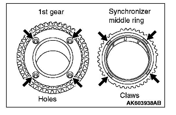 2. Install the synchronizer ring set No. 1 aligning the claws of the synchronizer middle ring to the positioning holes in the 1st gear.