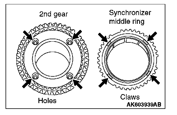 2. Install the synchronizer ring set No. 2 to the 2nd gear aligning the claws of the synchronizer middle ring to the positioning holes in the 2nd gear.