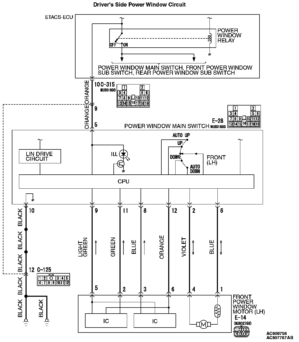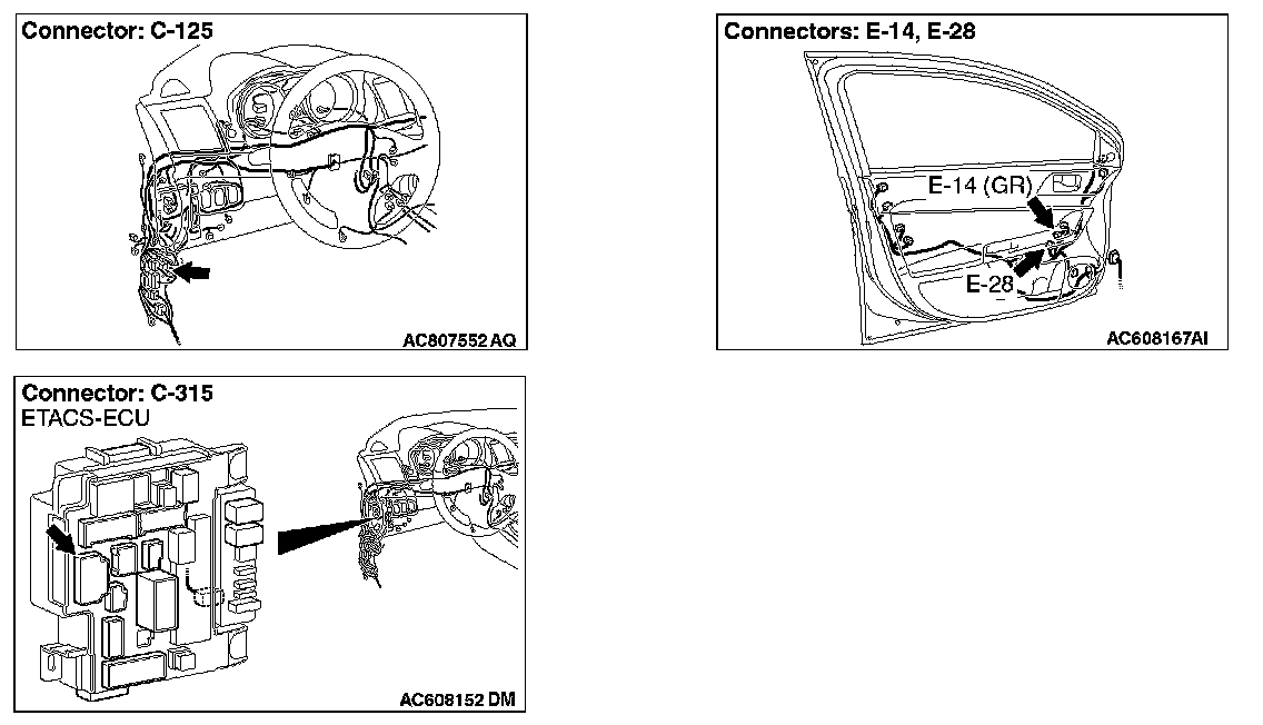 STEP 4. Check the ETACS-ECU connector C-315 line circuit to the power window main switch. Measure the voltage at power window main switch connector E-28.