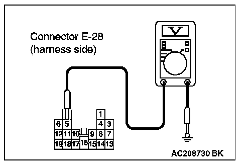 1. Disconnect power window main switch connector E-28 and measure the voltage available at the wiring harness side of the connector.