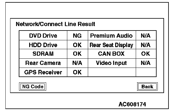 NOTE: If there is "NG" or "N/A" as the check results, select "NG Code" on the "Network/Connect Line Result" screen. Then "NG code Indication" screen will show the NG code.