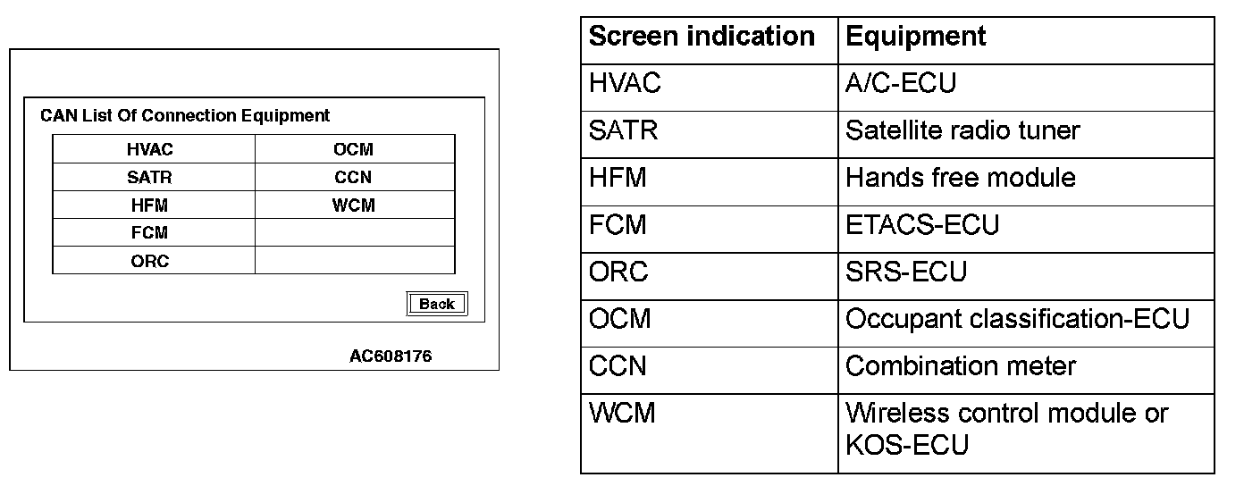 2. If "List Of Connection Equipment" is selected on "CAN Communication Confirmation" screen, the system will determine which equipment is installed according to the connected equipment reference table. Then the equipment which are connected to the CAN box unit will be displayed.