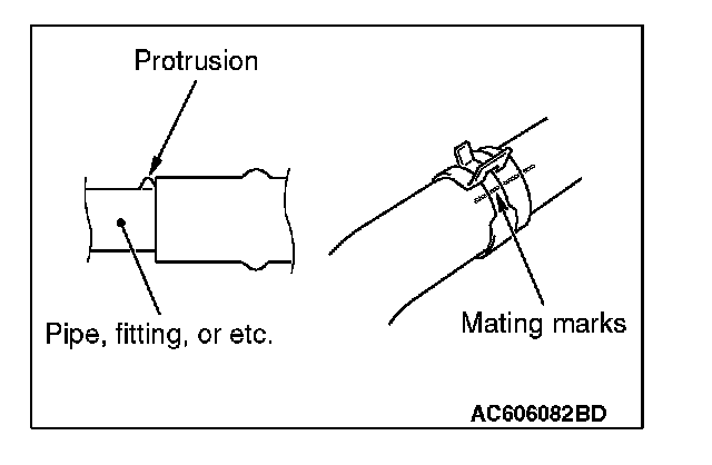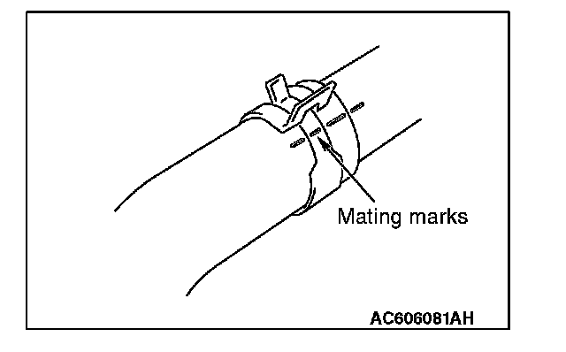 Make mating marks on the radiator hose and the hose clamp as shown to install them in the original position. Then, remove them.
