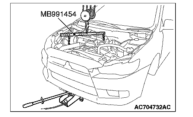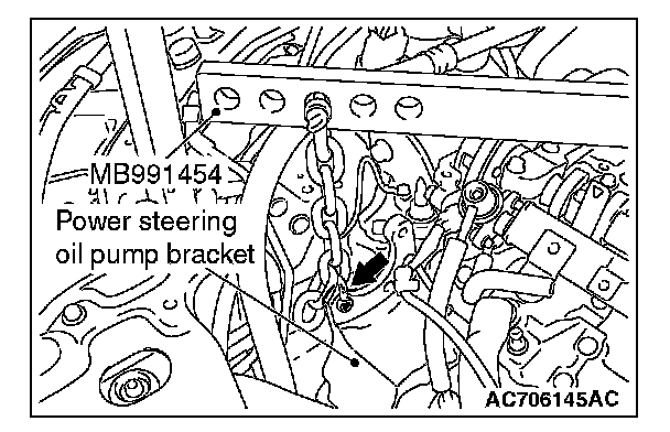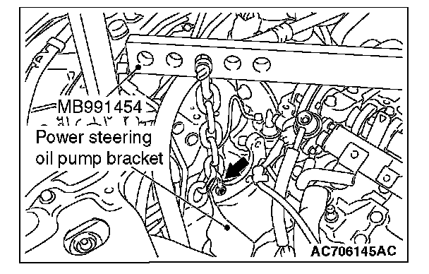 3. Set special tool MB991454 to the engine hanger and the power steering oil pump bracket.