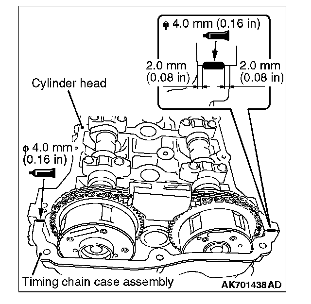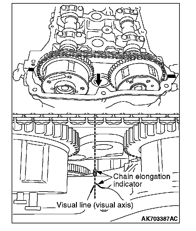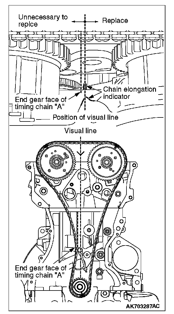 NOTE: When the timing chain elongates more than the specified length, the diagnosis code No. P0012, variable valve timing (VVT) advanced-angle value abnormal, is output Unless the diagnosis code No. P0012, therefore, is output, the visual check is unnecessary.