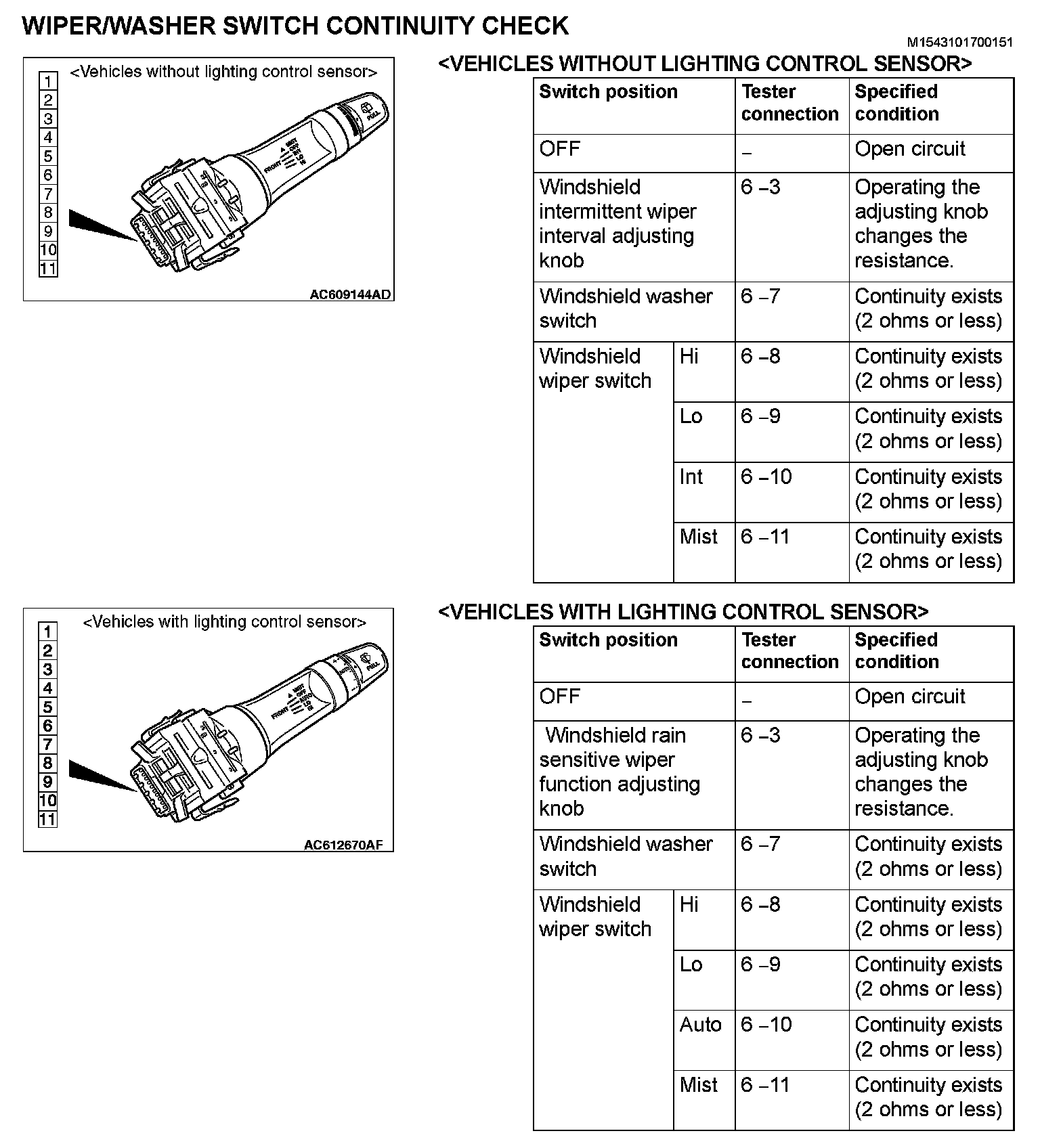 WIPER/WASHER SWITCH CONTINUITY CHECK