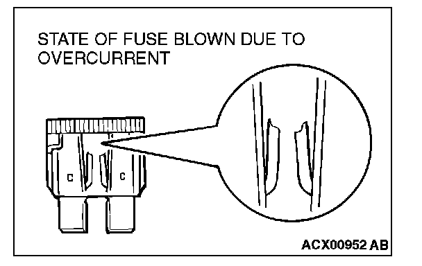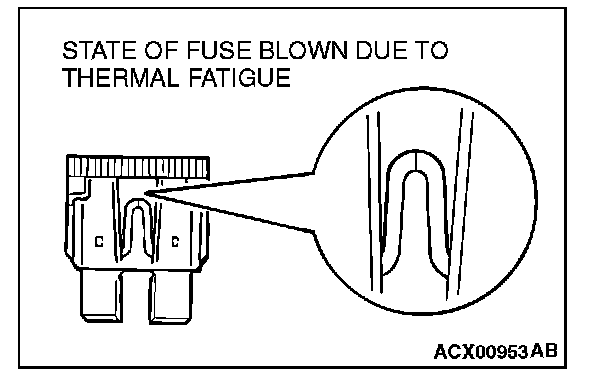 CAUTIONS IN EVENT OF BLOWN FUSEWhen a fuse is blown, there are two probable causes. One is that it is blown due to flow of current exceeding its rating. The other is that it is blown due to repeated on/off current flowing through it. Which of the two causes is responsible can be easily determined by visual check as described below.