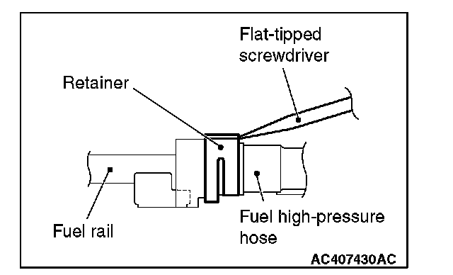 1) Insert a flat-tipped screwdriver [6 mm (0.24 inch) wide and 1 mm (0.04 inch) thick] into the retainer of the fuel high-pressure hose connector.