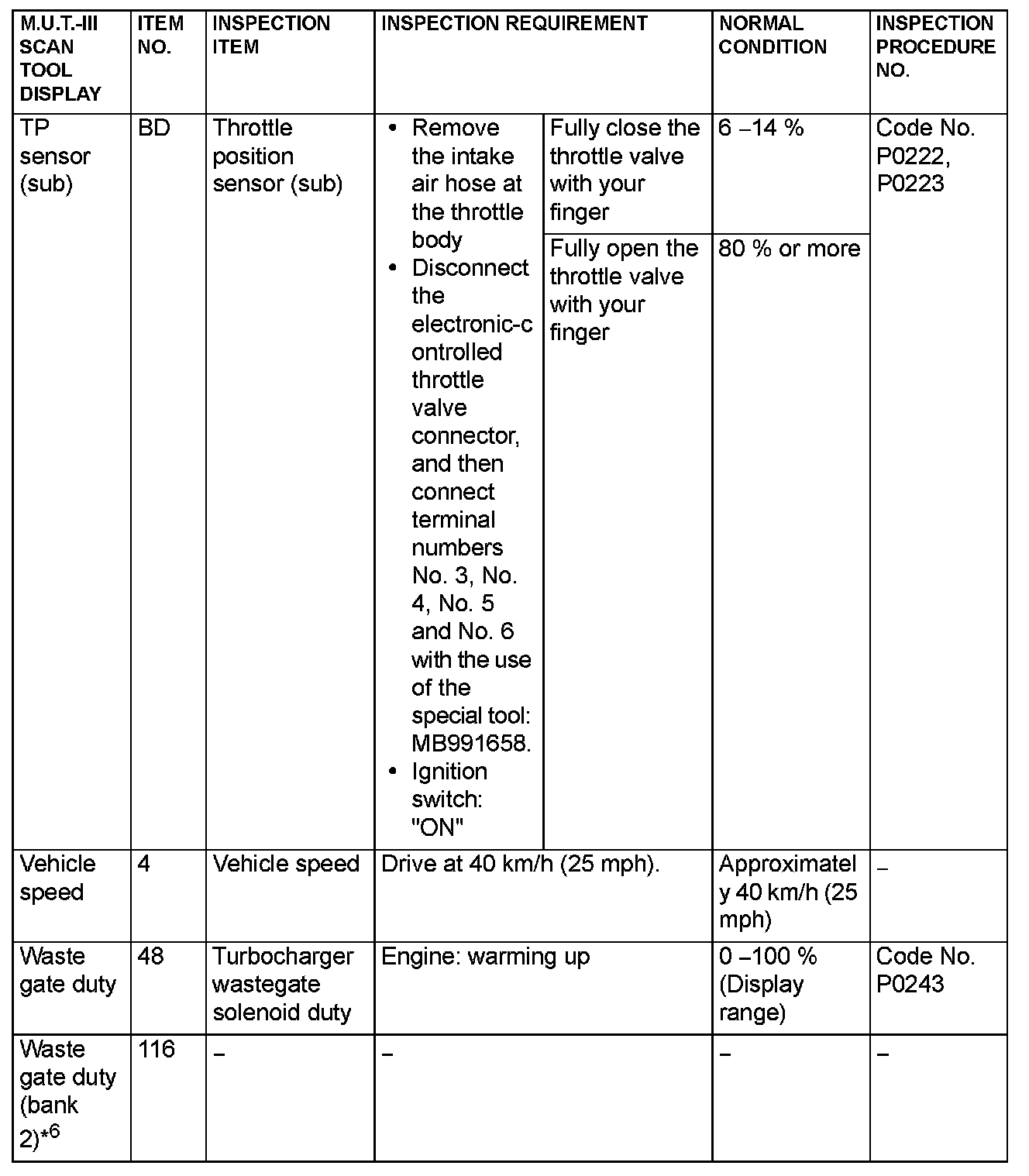 - *6: Data item is displayed on scan tool display, but the turbocharger wastegate solenoid 2 is not equipped and its data is displayed as "0 %".