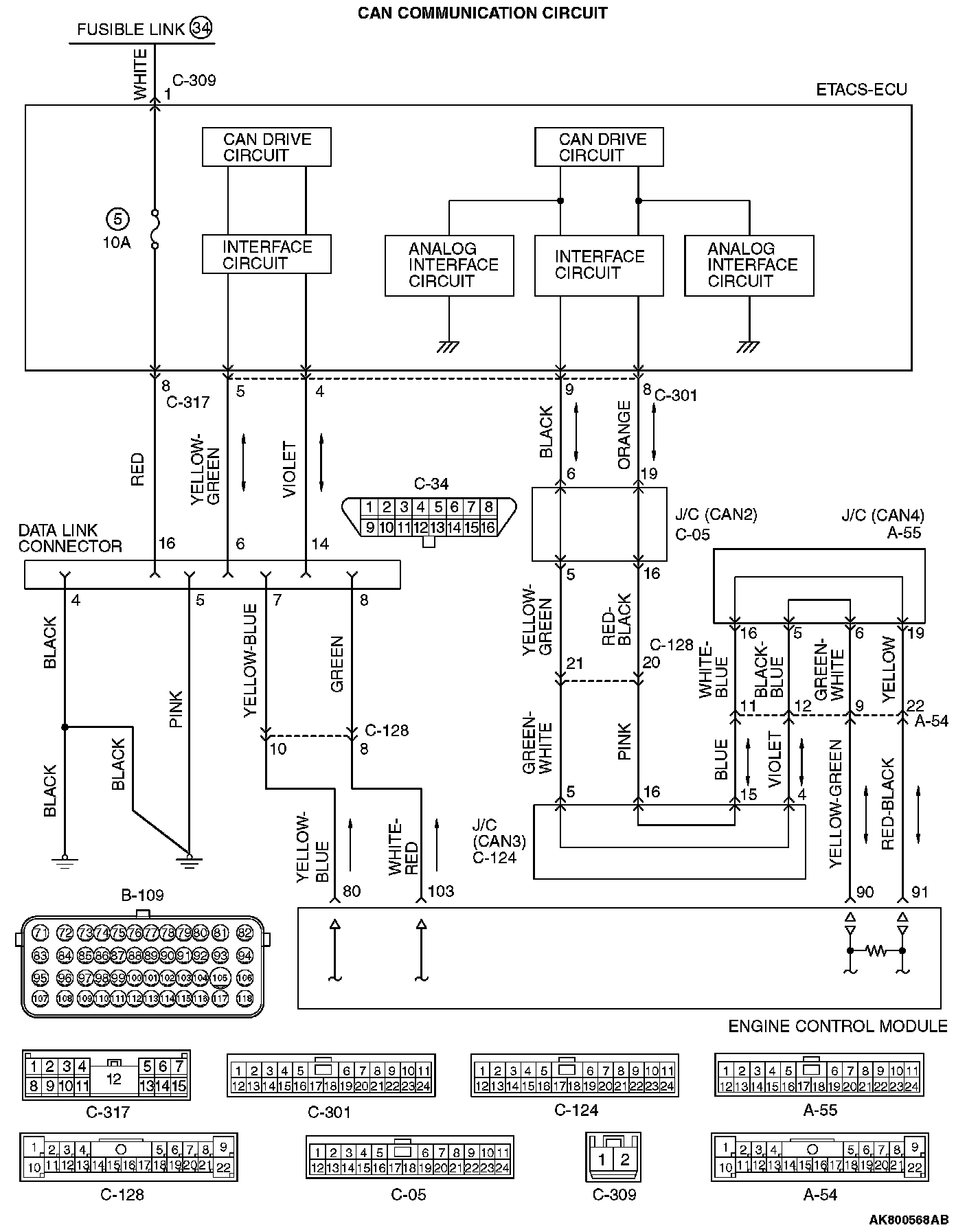 - When the communication between scan tool MB991958 and ECM is impossible, it can be suspected that the CAN bus line, power supply circuit of the data link connector, and/or grounding circuit are defective.