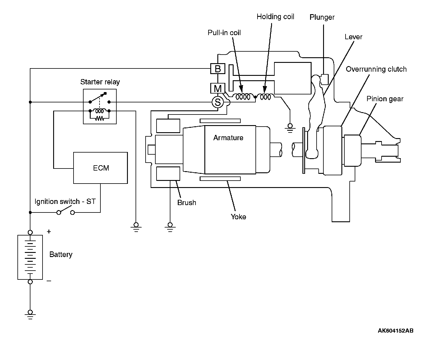 If the ignition switch is turned to the "START" position, current flows in the coil provided inside magnetic switch, attracting the plunger. When the plunger is attracted, the lever connected to the plunger is actuated to engage the starter clutch.