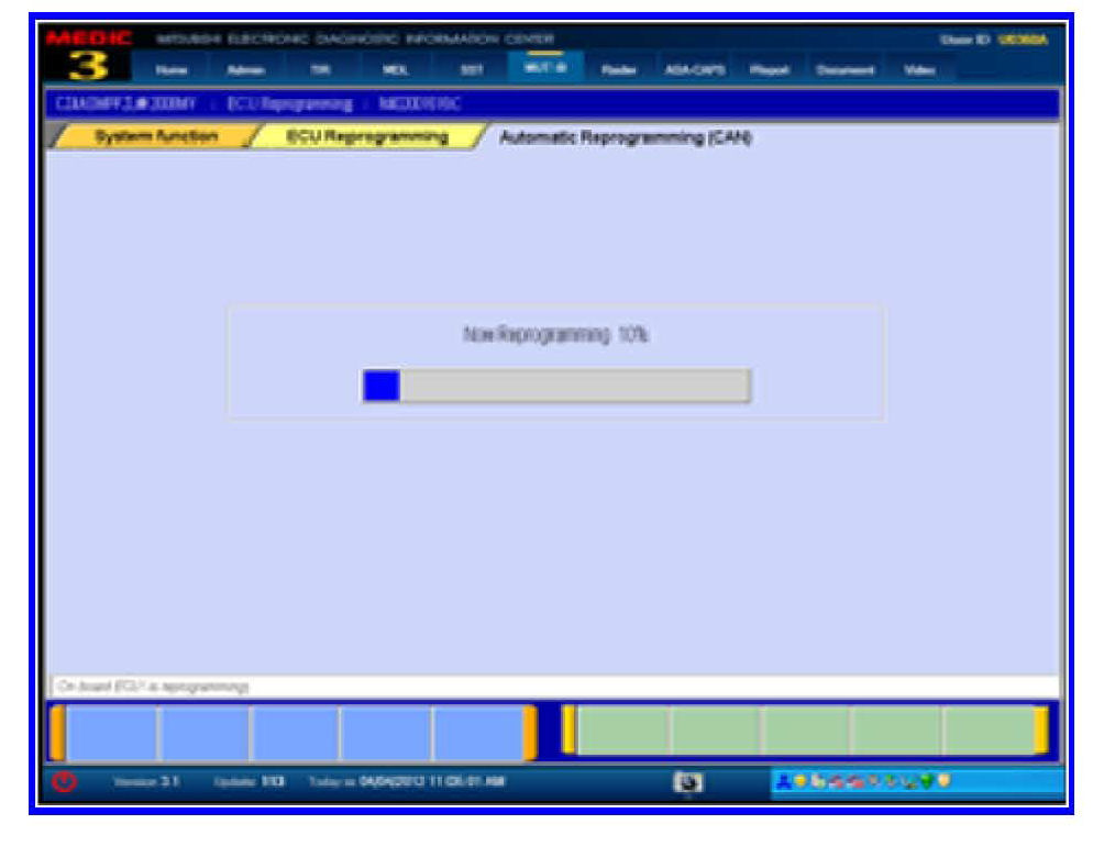 This process takes approximately seven minutes to complete. A battery charger should be attached to the vehicle battery and the MUT III should be plugged into it's charger to prevent the program from stopping prior to completion.
