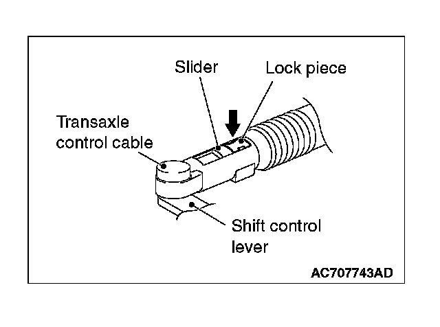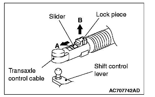 3. Move the slider of the transaxle control cable (transaxle side) tip to the direction A to pull up the lock piece to the direction B.