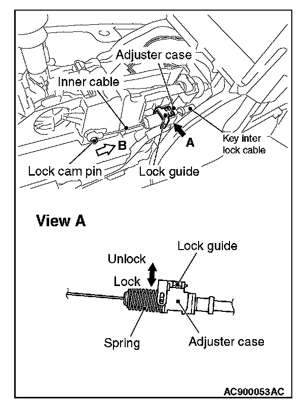 4. With the lock cam pin pushed in the direction B as shown in the figure to remove the slack from the key interlock cable, securely lower the lock guide and lock it.
