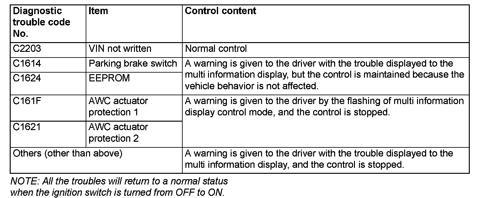 FAIL-SAFE FUNCTIONIf an abnormality occurs to the signal of sensors, switches, solenoids, or others, the AWC-ECU performs a control for the driver safety and system protection. The control contents are as follows.