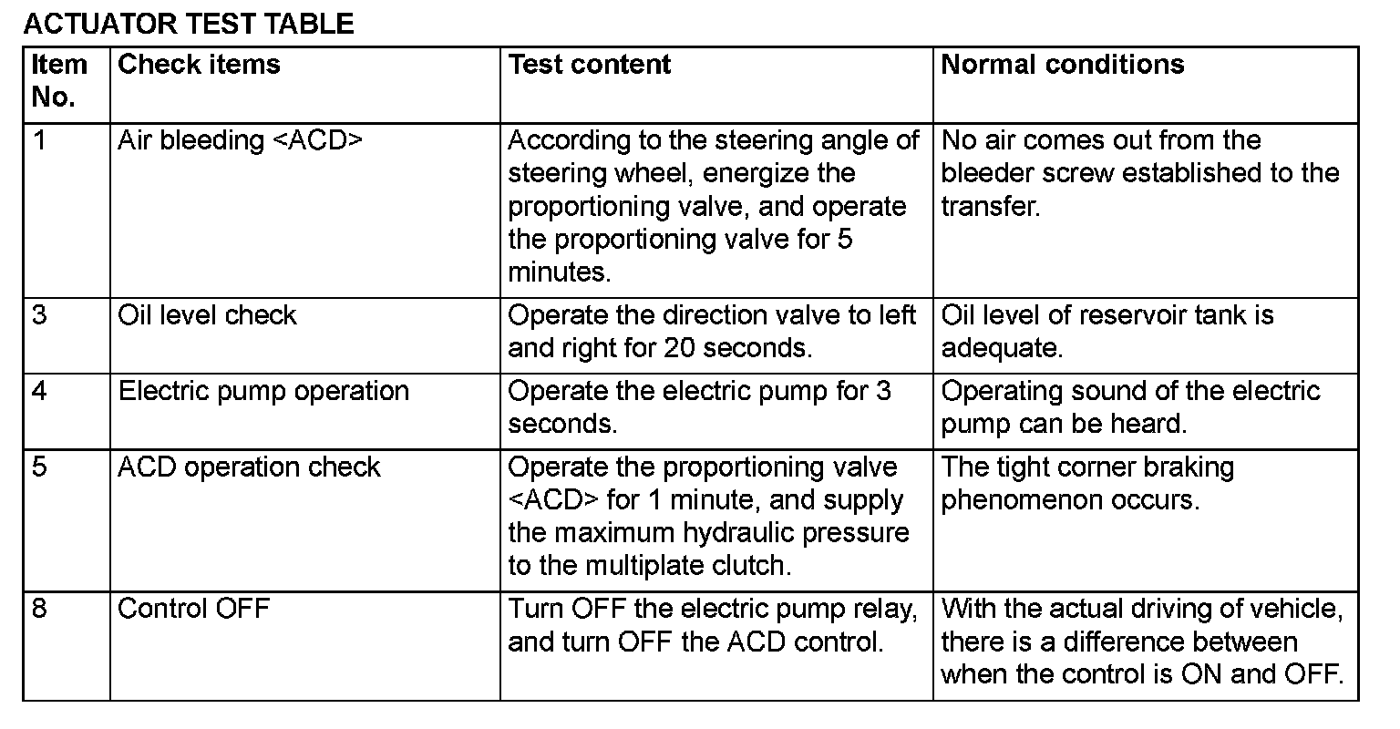 Since the fluid in the hydraulic unit will be hardened under low temperature, all the inspection items in the table may not be checked properly. Therefore, completely remove snow and ice from the hydraulic unit and leave the vehicle under temperature of 0 degrees C (32 degrees F) or higher for 4 hours or more before performing the actuator test.