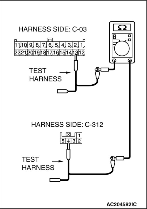 (2)Disconnect joint connector (3) C-03 and steering wheel sensor connector C-312, and measure the resistance between the wiring harness side connector of steering wheel sensor connector C-312 and joint connector (3) C-03.