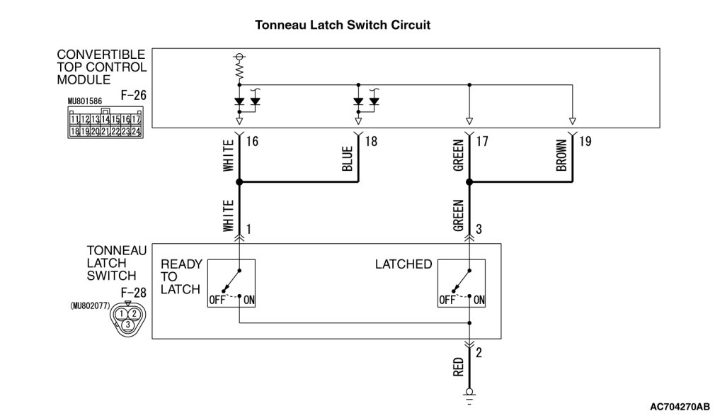 - The tonneau latch switch is the one of those switches and it consists of a tonneau latch switch (Ready to latch) detecting the tonneau panel state and a tonneau latch switch (Latched) detecting the tonneau latch state. Signals from the tonneau latch switch (Ready to latch) and the tonneau latch switch (Latched) are input through different circuits to the convertible top control module, and the following signals are output to the convertible top control module according to the opening state of the convertible top.